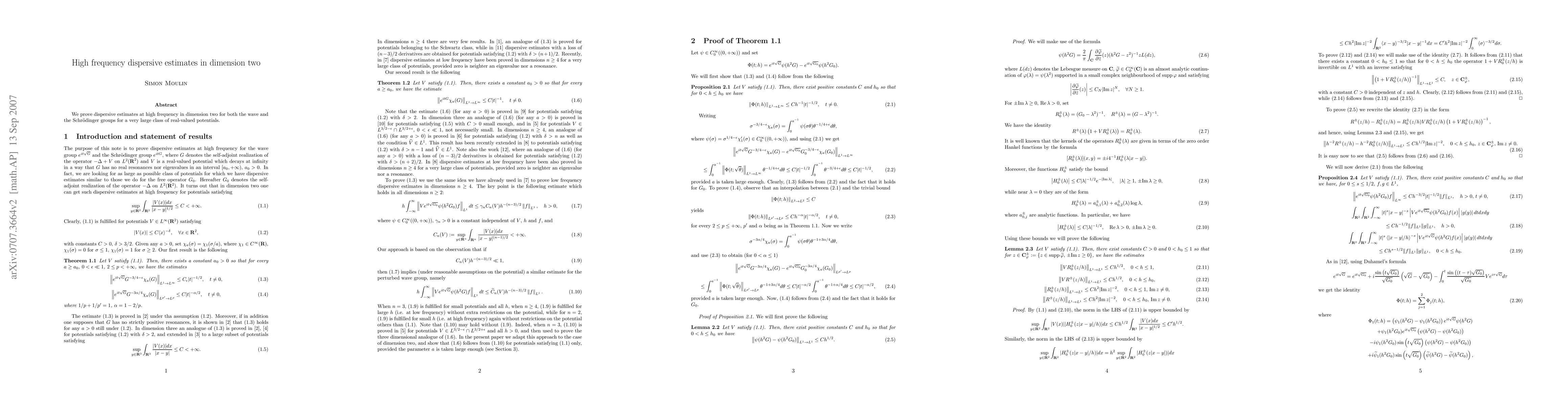 Summary: This paper establishes high-frequency dispersive estimates in two dimensions for both the wave and Schrödinger groups, applicable to a broad range of real-valued potentials. The results provide significant insights into the behavior of these systems under high-frequency conditions.