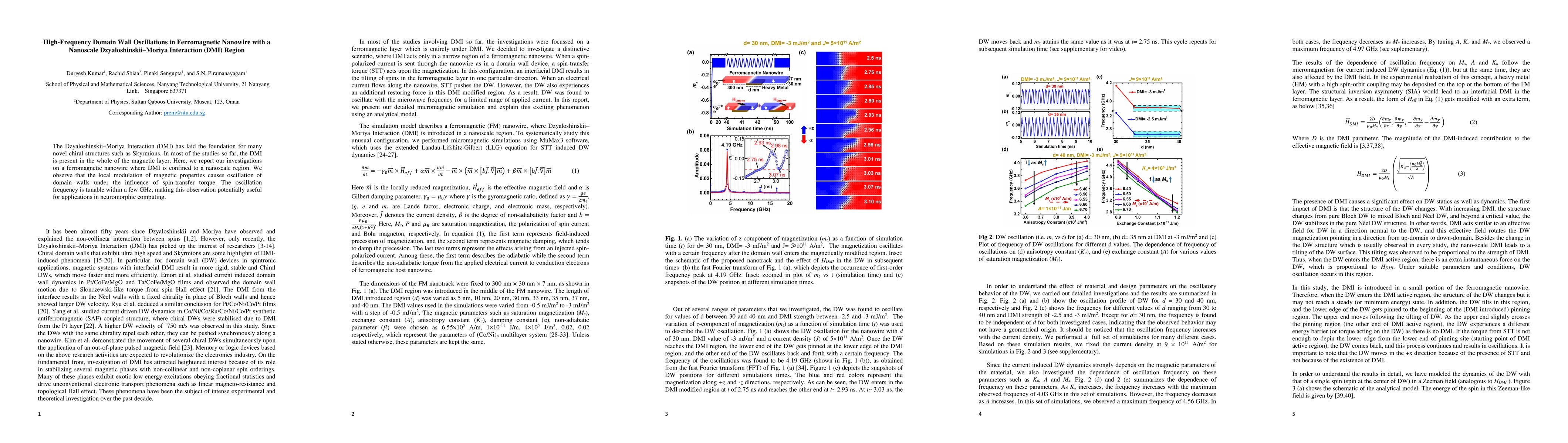 This study investigates domain wall oscillations in ferromagnetic nanowires with a nanoscale Dzyaloshinskii Moriya Interaction (DMI) region, revealing tunable oscillations within a few GHz under spin-transfer torque, which could be useful for neuromorphic computing applications.