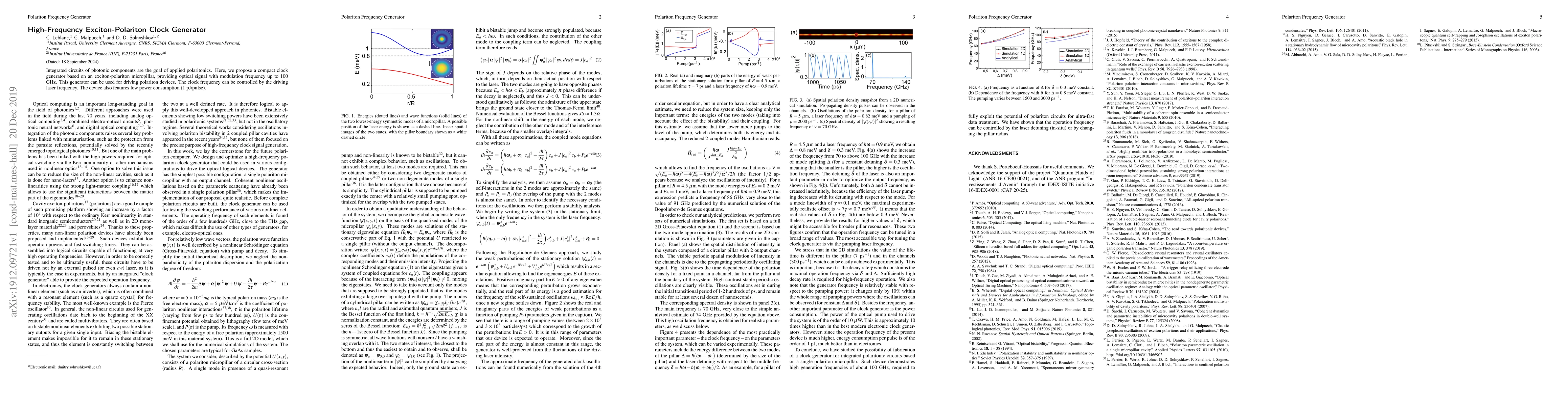 Integrated circuits of photonic components are the goal of applied polaritonics. Here, we propose a compact clock generator based on an exciton-polariton micropillar, providing optical signal with modulation frequency up to 100 GHz. This generator can be used for driving polariton devices. The clock frequency can be controlled by the driving laser frequency. The device also features low power consumption (1 pJ/pulse).