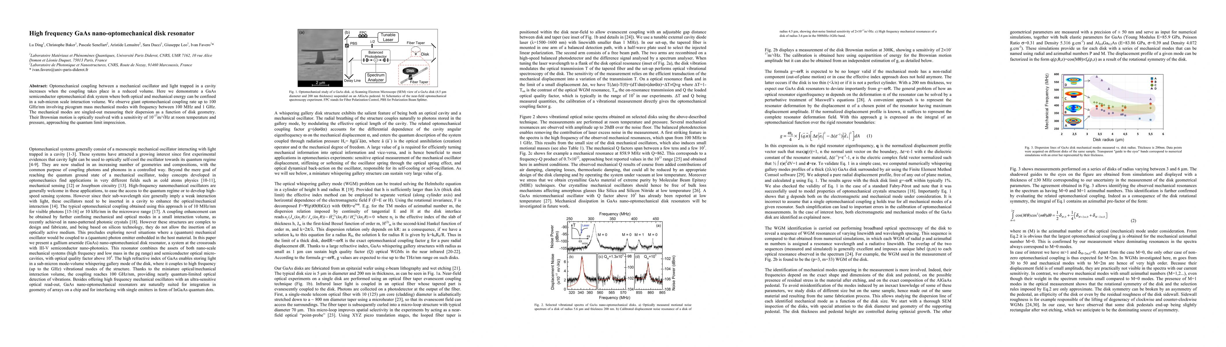 This paper demonstrates a high-frequency GaAs nano-optomechanical disk resonator with giant optomechanical coupling rates up to 100 GHz/nm, achieving picogram mass mechanical modes and Brownian motion resolution at room conditions, approaching quantum limit precision.