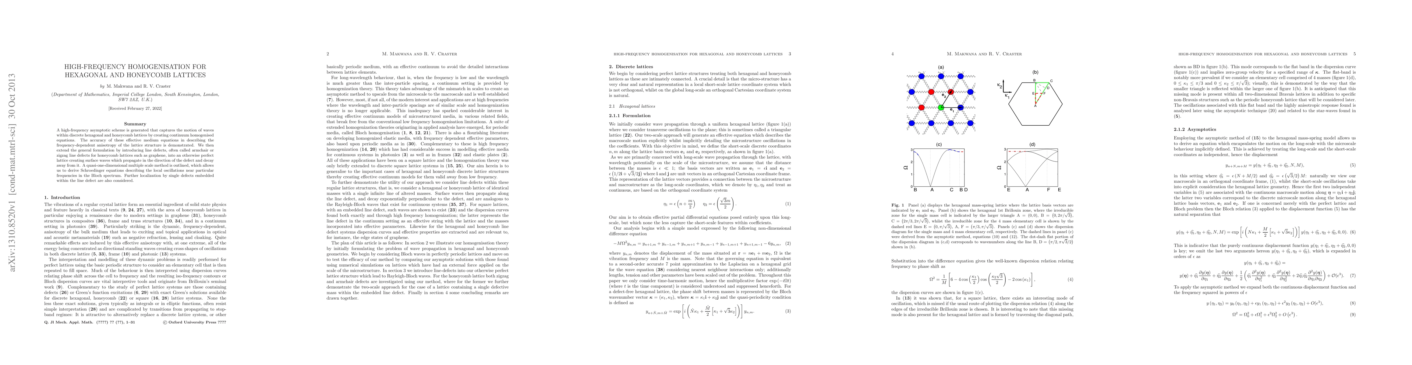 A high-frequency asymptotic scheme is generated that captures the motion of waves within discrete hexagonal and honeycomb lattices by creating continuum homogenised equations. The accuracy of these effective medium equations in describing the frequency-dependent anisotropy of the lattice structure is demonstrated. We then extend the general formulation by introducing line defects, often called armchair or zigzag line defects for honeycomb lattices such as graphene, into an otherwise perfect lattice creating surface waves which propagate in the direction of the defect and decay away from it. A quasi-one-dimensional multiple scale method is outlined, which allows us to derive Schroedinger equations describing the local oscillations near particular frequencies in the Bloch spectrum. Further localization by single defects embedded within the line defect are also considered.