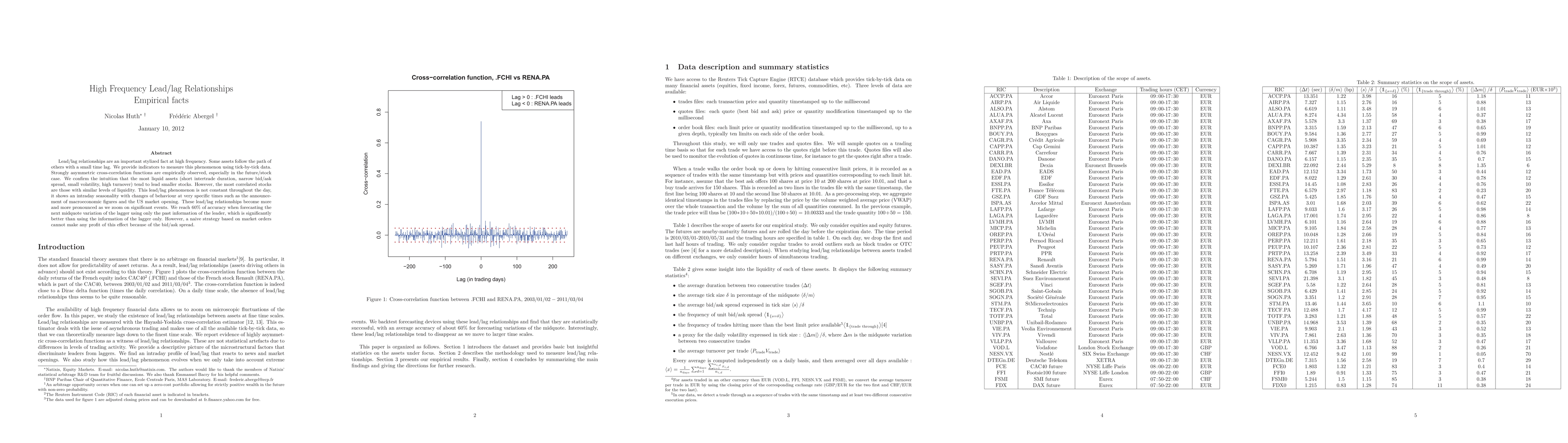 Lead/lag relationships are an important stylized fact at high frequency. Some assets follow the path of others with a small time lag. We provide indicators to measure this phenomenon using tick-by-tick data. Strongly asymmetric cross-correlation functions are empirically observed, especially in the future/stock case. We confirm the intuition that the most liquid assets (short intertrade duration, narrow bid/ask spread, small volatility, high turnover) tend to lead smaller stocks. However, the most correlated stocks are those with similar levels of liquidity. This lead/lag phenomenon is not constant throughout the day, it shows an intraday seasonality with changes of behaviour at very specific times such as the announcement of macroeconomic figures and the US market opening. These lead/lag relationships become more and more pronounced as we zoom on significant events. We reach 60% of accuracy when forecasting the next midquote variation of the lagger using only the past information of the leader, which is significantly better than using the information of the lagger only. However, a naive strategy based on market orders cannot make any profit of this effect because of the bid/ask spread.