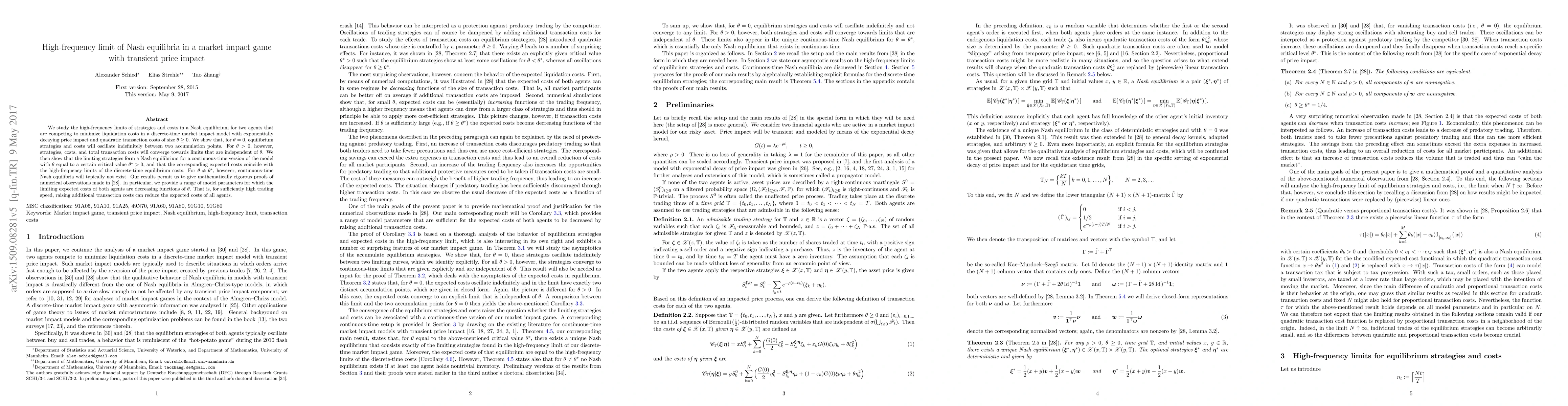This paper investigates the high-frequency limit of Nash equilibria in a market impact game where two agents compete to minimize liquidation costs under a discrete-time model with transient price impact. It finds that for zero transaction costs, equilibrium strategies oscillate indefinitely, while for positive costs, they converge to limits independent of the cost size.