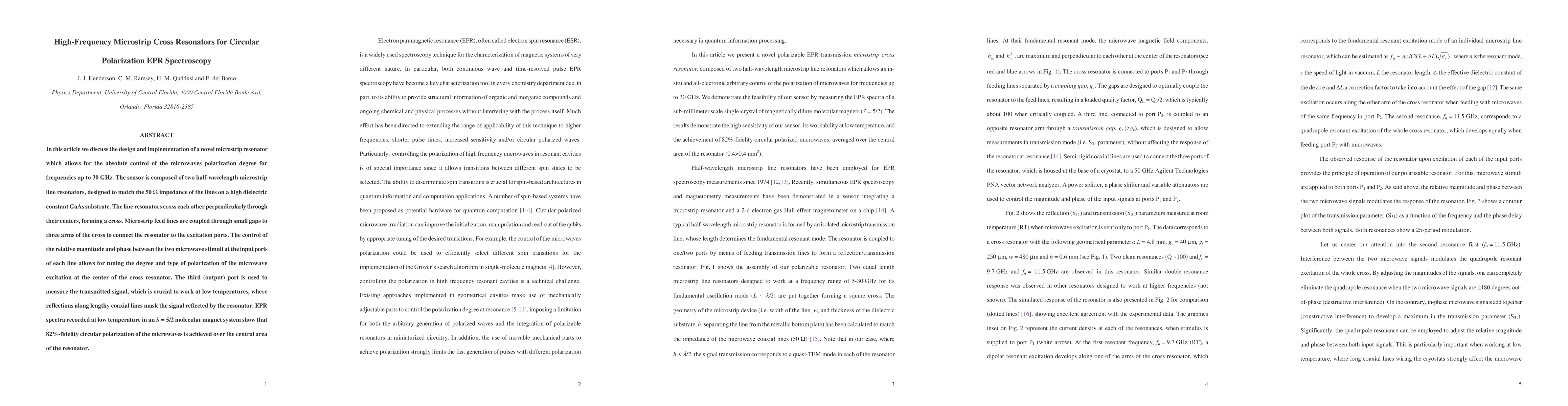 This paper presents a novel microstrip cross resonator designed for high-fidelity circular polarization in electron paramagnetic resonance (EPR) spectroscopy at frequencies up to 30 GHz, achieving 82% fidelity in a molecular magnet system. The design allows precise control over microwave polarization through the relative magnitude and phase of the input stimuli.