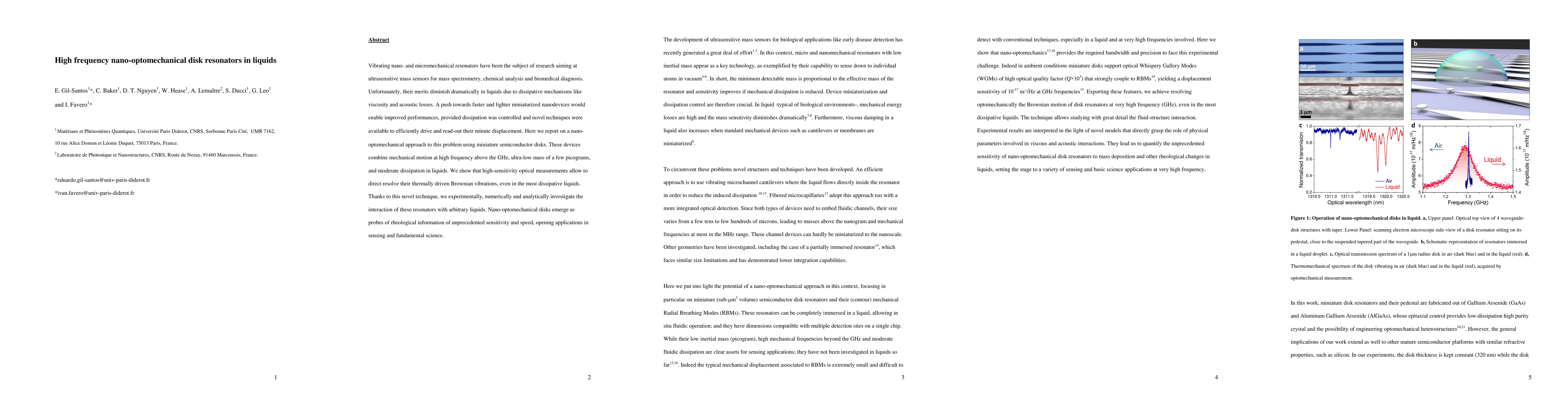 Vibrating nano- and micromechanical resonators have been the subject of research aiming at ultrasensitive mass sensors for mass spectrometry, chemical analysis and biomedical diagnosis. Unfortunately, their merits diminish dramatically in liquids due to dissipative mechanisms like viscosity and acoustic losses. A push towards faster and lighter miniaturized nanodevices would enable improved performances, provided dissipation was controlled and novel techniques were available to efficiently drive and read-out their minute displacement. Here we report on a nano-optomechanical approach to this problem using miniature semiconductor disks. These devices combine mechanical motion at high frequency above the GHz, ultra-low mass of a few picograms, and moderate dissipation in liquids. We show that high-sensitivity optical measurements allow to direct resolve their thermally driven Brownian vibrations, even in the most dissipative liquids. Thanks to this novel technique, we experimentally, numerically and analytically investigate the interaction of these resonators with arbitrary liquids. Nano-optomechanical disks emerge as probes of rheological information of unprecedented sensitivity and speed, opening applications in sensing and fundamental science.