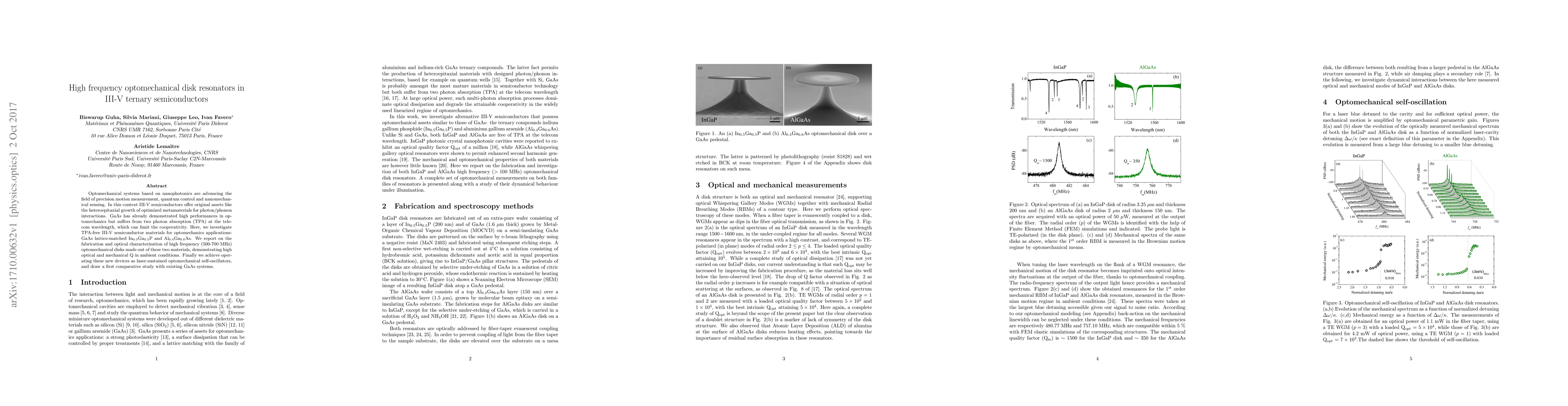 Optomechanical systems based on nanophotonics are advancing the field of precision motion measurement, quantum control and nanomechanical sensing. In this context III-V semiconductors offer original assets like the heteroepitaxial growth of optimized metamaterials for photon/phonon interactions. GaAs has already demonstrated high performances in optomechanics but suffers from two photon absorption (TPA) at the telecom wavelength, which can limit the cooperativity. Here, we investigate TPA-free III-V semiconductor materials for optomechanics applications: GaAs lattice-matched In0:5Ga0:5P and Al0:4Ga0:6As. We report on the fabrication and optical characterization of high frequency (500-700 MHz) optomechanical disks made out of these two materials, demonstrating high optical and mechanical Q in ambient conditions. Finally we achieve operating these new devices as laser-sustained optomechanical self-oscillators, and draw a first comparative study with existing GaAs systems.