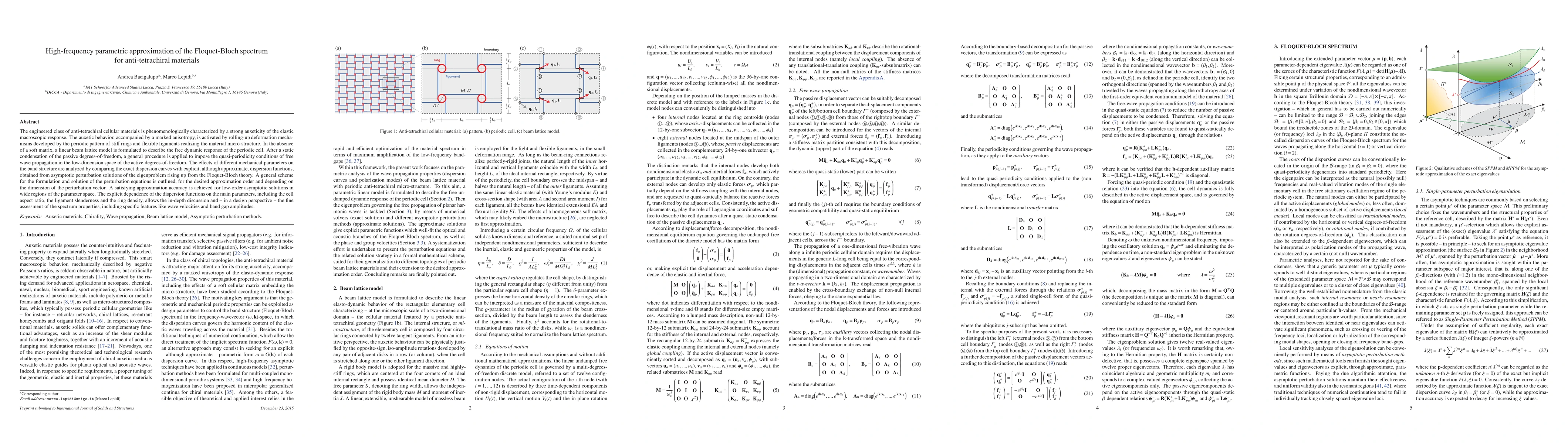 This paper develops a high-frequency parametric approximation for the Floquet-Bloch spectrum of anti-tetrachiral materials, characterized by auxeticity and anisotropy due to their unique micro-structure. The study formulates a linear beam lattice model and applies perturbation solutions to analyze the band structure's dependence on key mechanical parameters, achieving accurate approximations for low-order solutions.