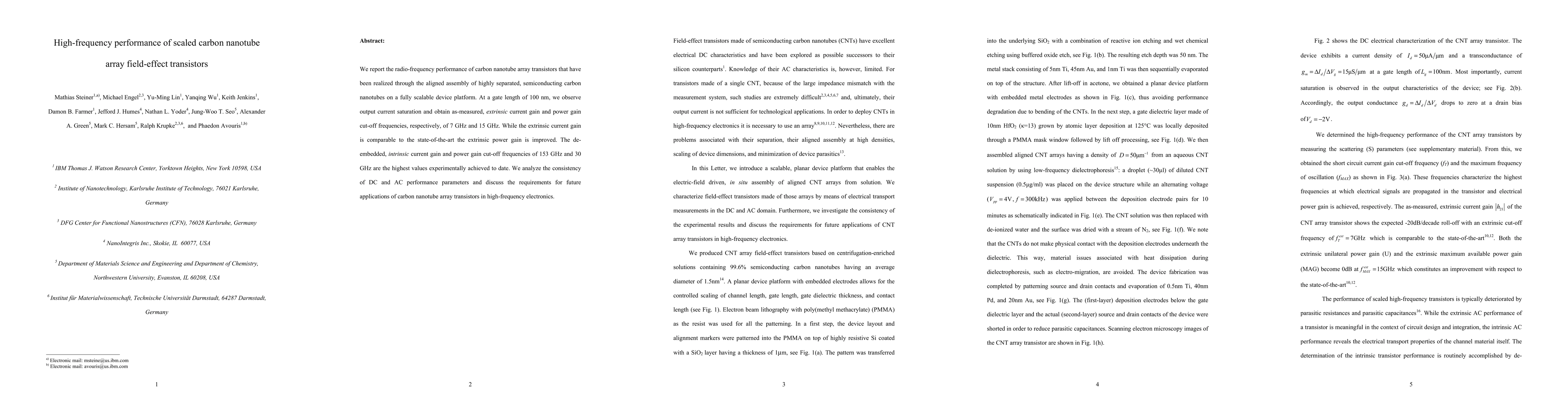 This paper reports on the high-frequency performance of scaled carbon nanotube array field-effect transistors, achieving extrinsic current and power gain cut-off frequencies of 7 GHz and 15 GHz respectively, and intrinsic values of 153 GHz and 30 GHz, the highest to date. The study analyzes DC and AC parameters and discusses their future applications in high-frequency electronics.