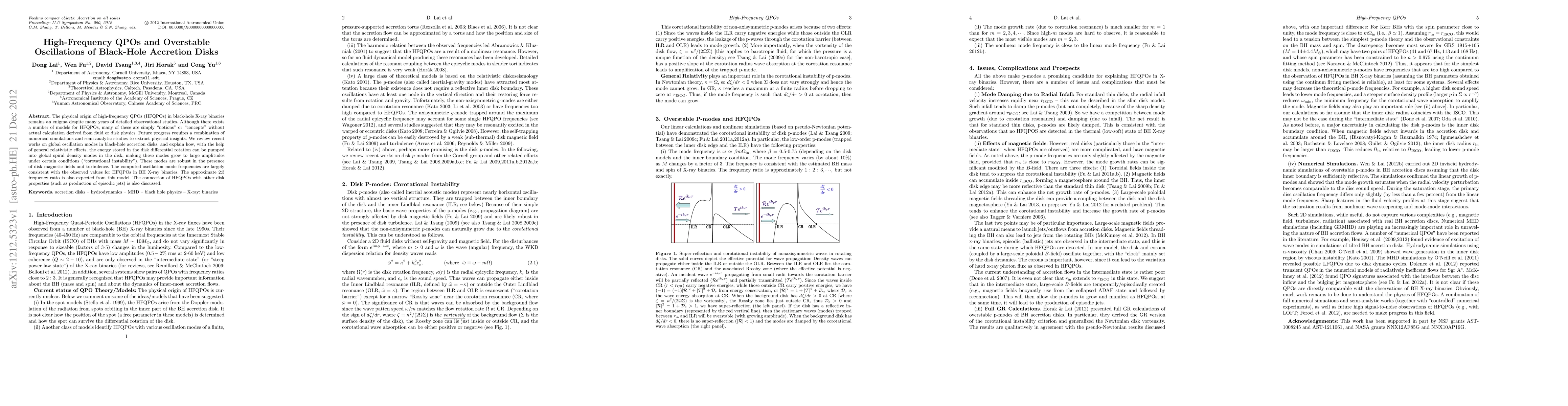 The paper reviews recent studies on global oscillation modes in black-hole accretion disks, suggesting that relativistic effects can pump disk rotation energy into spiral density modes, causing them to grow to large amplitudes. These computed mode frequencies align with observed HFQPOs in BH X-ray binaries, including their approximate 2:3 ratio, and discuss their connection with episodic jet production.
