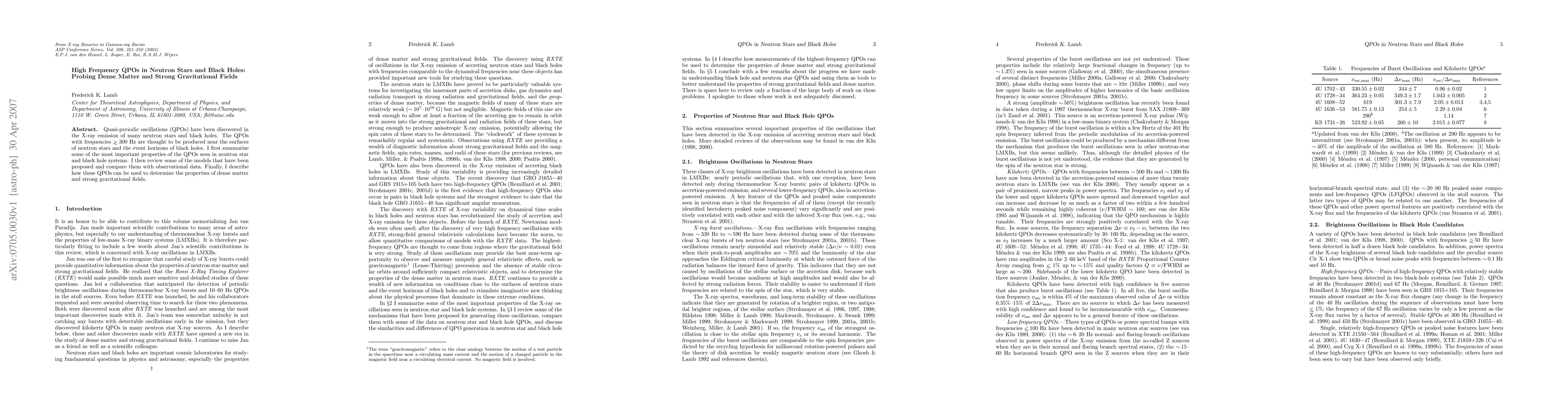 This paper reviews quasi-periodic oscillations (QPOs) in neutron stars and black holes, focusing on high-frequency QPOs above 300 Hz, and discusses models explaining their origin and their potential to probe dense matter and strong gravitational fields.