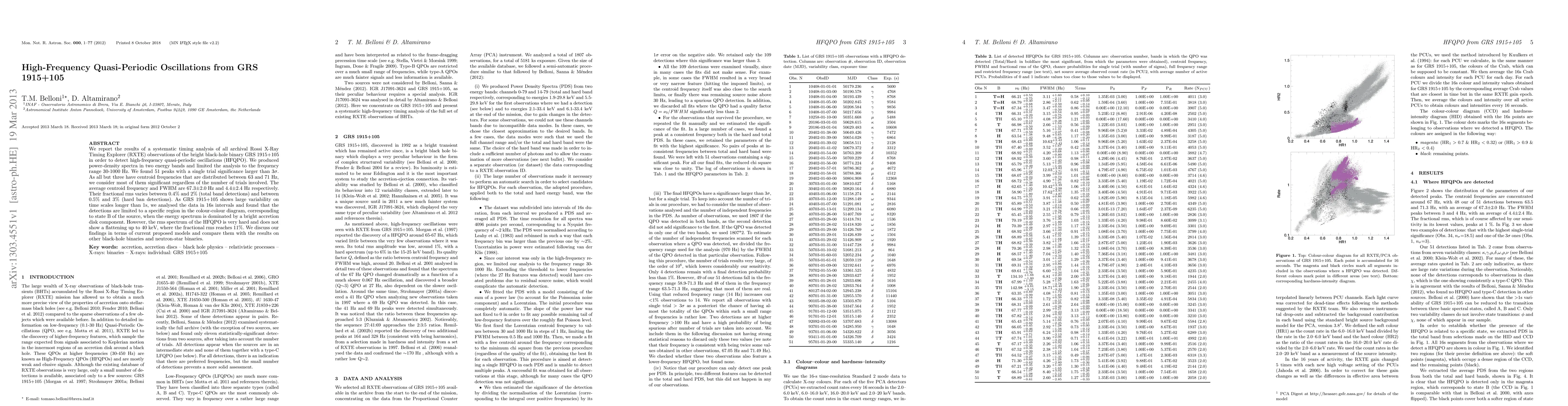 We report the results of a systematic timing analysis of all archival Rossi X-Ray Timing Explorer (RXTE) observations of the bright black-hole binary GRS 1915+105 in order to detect high-frequency quasi-periodic oscillations (HFQPO). We produced power-density spectra in two energy bands and limited the analysis to the frequency range 30-1000 Hz. We found 51 peaks with a single trial significance larger than 3 sigma. As all but three have centroid frequencies that are distributed between 63 and 71 Hz, we consider most of them significant regardless of the number of trials involved. The average centroid frequency and FWHM are 67.3 +/- 2.0 Hz and 4.4 +/- 2.4 Hz respectively. Their fractional rms varies between 0.4% and 2% (total band detections) and between 0.5% and 3% (hard ban detections). As GRS 1915+105 shows large variability on time scales longer than 1s, we analysed the data in 16s intervals and found that the detections are limited to a specific region in the colour-colour diagram, corresponding to state B of the source, when the energy spectrum is dominated by a bright accretion disk component. However, the rms spectrum of the HFQPO is very hard and does not show a flattening up to 40 keV, where the fractional rms reaches 11%. We discuss our findings in terms of current proposed models and compare them with the results on other black-hole binaries and neutron-star binaries.