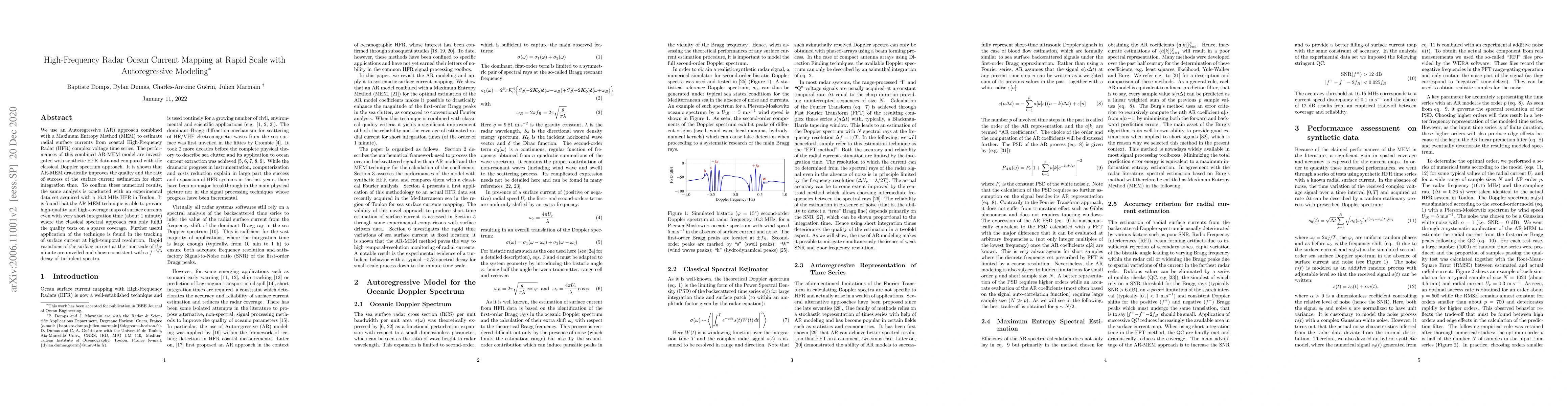 We use an Autoregressive (AR) approach combined with a Maximum Entropy Method (MEM) to estimate radial surface currents from coastal High-Frequency Radar (HFR) complex voltage time series. The performances of this combined AR-MEM model are investigated with synthetic HFR data and compared with the classical Doppler spectrum approach. It is shown that AR-MEM drastically improves the quality and the rate of success of the surface current estimation for short integration time. To confirm these numerical results, the same analysis is conducted with an experimental data set acquired with a 16.3 MHz HFR in Toulon. It is found that the AR-MEM technique is able to provide high-quality and high-coverage maps of surface currents even with very short integration time (about 1 minute) where the classical spectral approach can only fulfill the quality tests on a sparse coverage. Further useful application of the technique is found in the tracking of surface current at high-temporal resolution. Rapid variations of the surface current at the time scale of the minute are unveiled and shown consistent with a $f^{-5/3}$ decay of turbulent spectra.