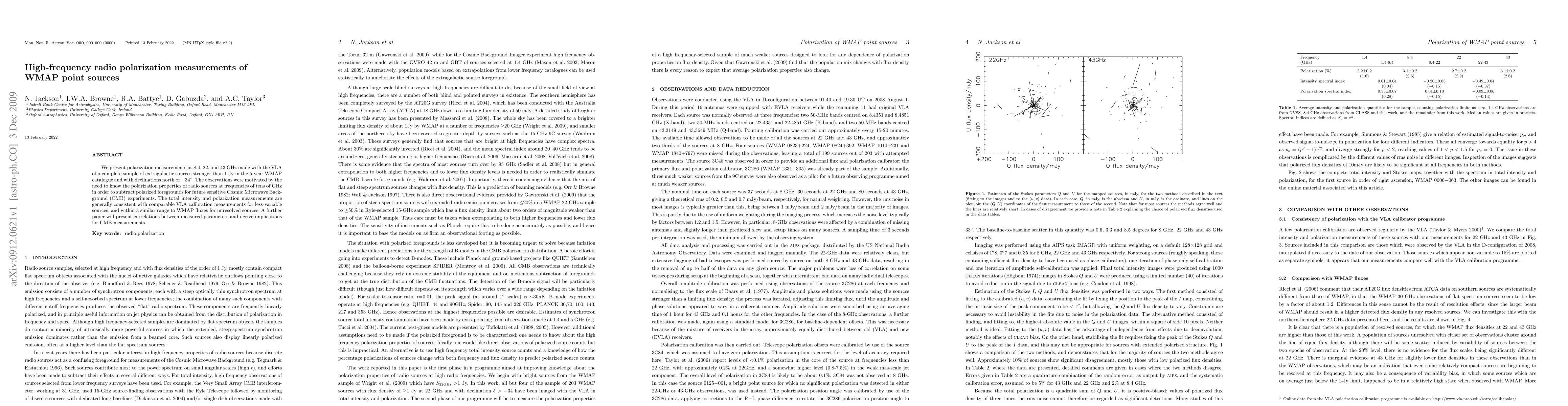 This paper reports high-frequency polarization measurements at 8.4, 22, and 43 GHz using the VLA for extragalactic sources stronger than 1 Jy from the WMAP catalogue. The study aims to understand radio source polarization properties to aid in subtracting foregrounds for future CMB experiments.