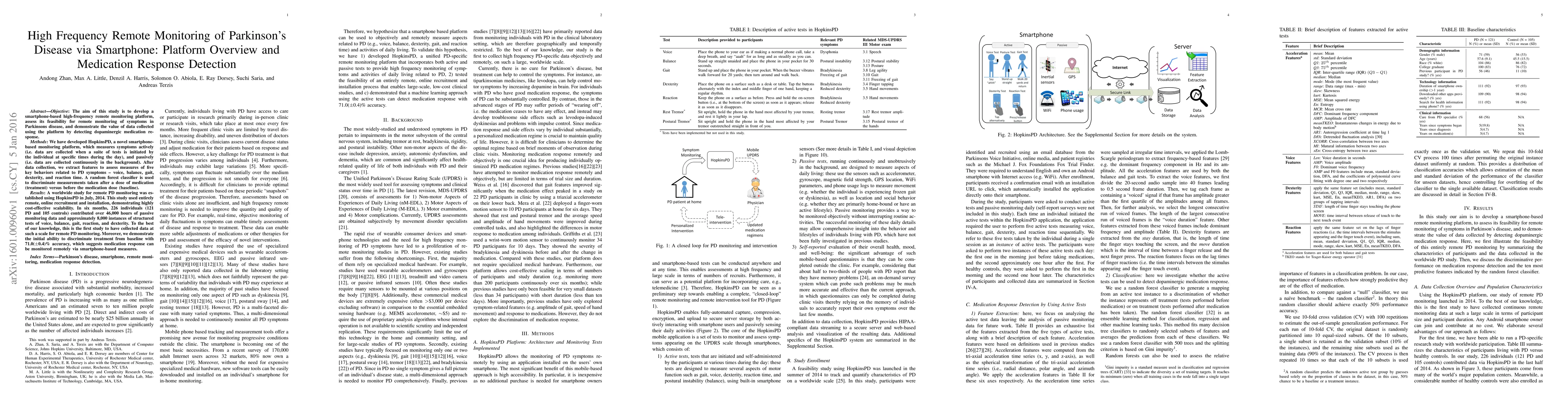 This study developed HopkinsPD, a smartphone platform for high-frequency remote monitoring of Parkinson's disease symptoms, and demonstrated its feasibility and scalability through worldwide remote recruitment. The platform's ability to detect dopaminergic medication response was shown with 71.0% accuracy, indicating potential for remote monitoring of medication effects.