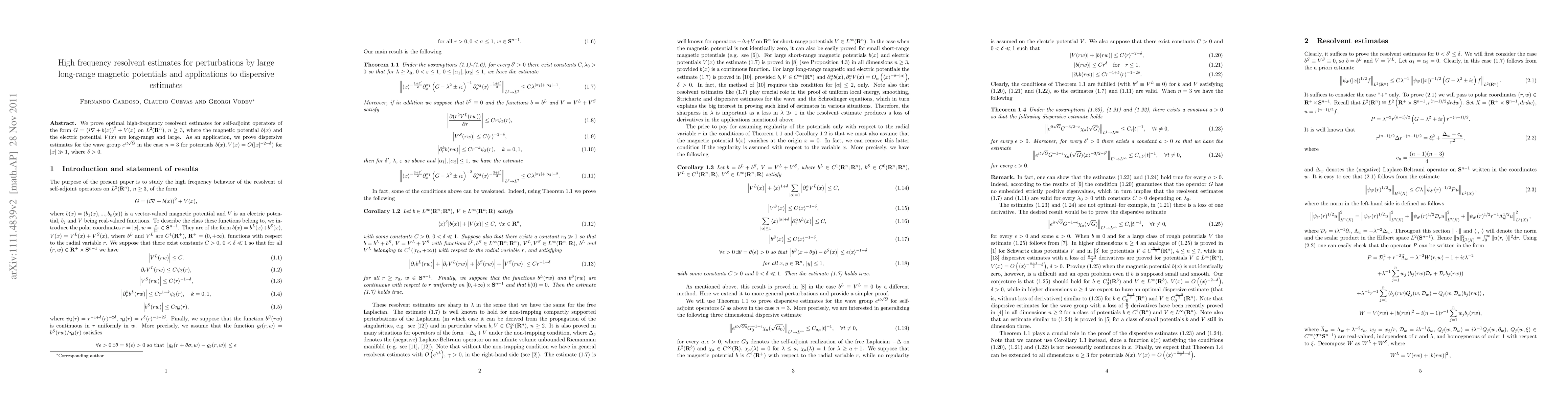 Summary: This paper establishes optimal high-frequency resolvent estimates for Laplacian perturbations by large long-range magnetic and electric potentials across all dimensions $n\ge 3$, and applies these results to derive dispersive estimates for wave groups in three dimensions.