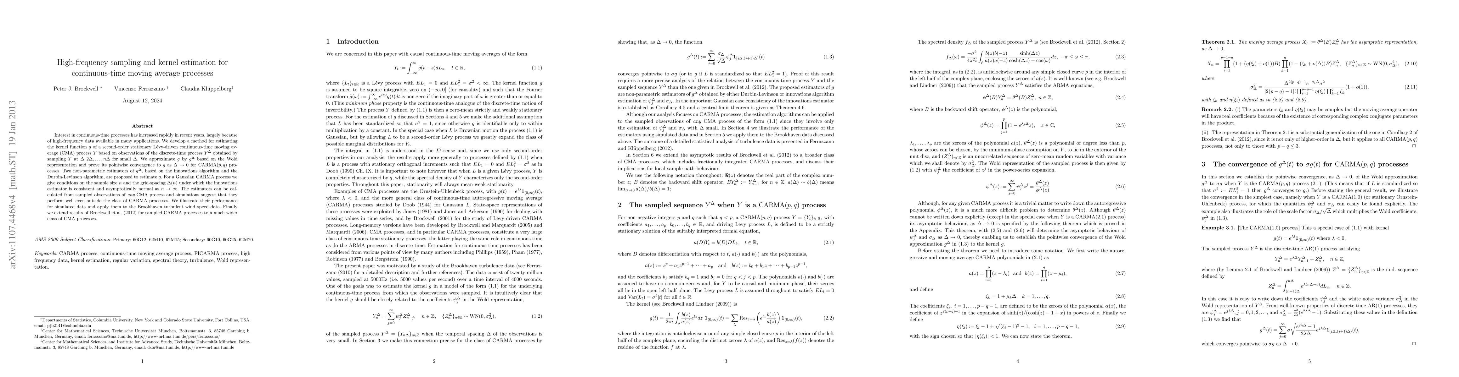 Interest in continuous-time processes has increased rapidly in recent years, largely because of high-frequency data available in many applications. We develop a method for estimating the kernel function $g$ of a second-order stationary L\'evy-driven continuous-time moving average (CMA) process $Y$ based on observations of the discrete-time process $Y^\Delta$ obtained by sampling $Y$ at $\Delta, 2\Delta,...,n\Delta$ for small $\Delta$. We approximate $g$ by $g^\Delta$ based on the Wold representation and prove its pointwise convergence to $g$ as $\Delta\rightarrow 0$ for $\CARMA(p,q)$ processes. Two non-parametric estimators of $g^\Delta$, based on the innovations algorithm and the Durbin-Levinson algorithm, are proposed to estimate $g$. For a Gaussian CARMA process we give conditions on the sample size $n$ and the grid-spacing $\Delta(n)$ under which the innovations estimator is consistent and asymptotically normal as $n\rightarrow\infty$. The estimators can be calculated from sampled observations of {\it any} CMA process and simulations suggest that they perform well even outside the class of CARMA processes. We illustrate their performance for simulated data and apply them to the Brookhaven turbulent wind speed data. Finally we extend results of \citet{bfk:2011:1} for sampled CARMA processes to a much wider class of CMA processes.