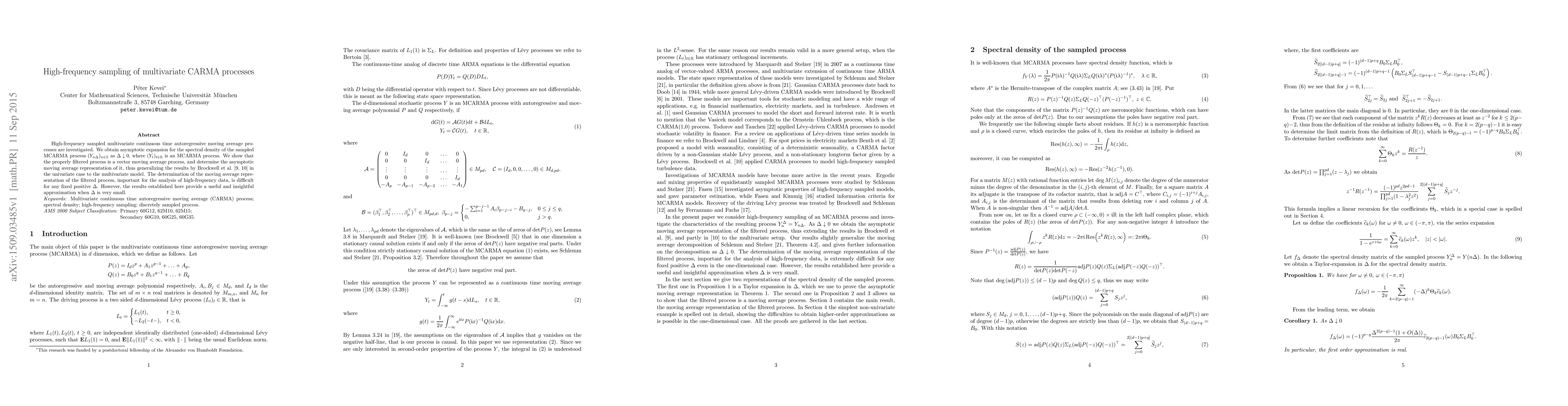 This paper investigates high-frequency sampling of multivariate continuous time autoregressive moving average (MCARMA) processes, deriving an asymptotic expansion for the spectral density as sampling frequency increases. It generalizes Brockwell et al.'s univariate results to the multivariate case by determining the asymptotic moving average representation of the properly filtered process.