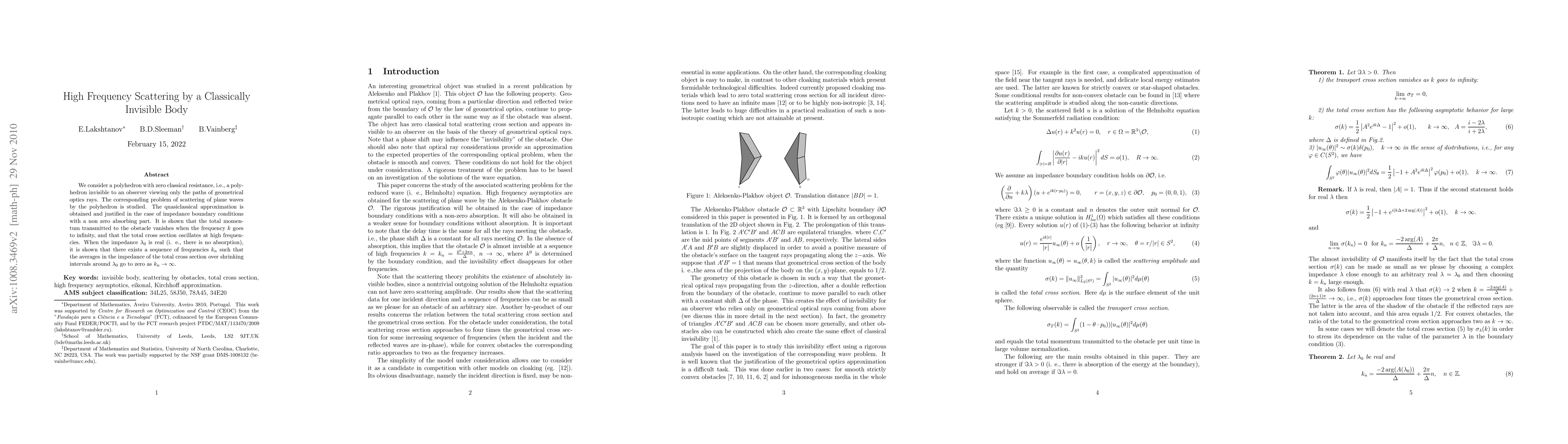 Research investigates how a polyhedron with zero classical resistance scatters plane waves at high frequencies, finding that the total momentum transmitted to the obstacle vanishes and the cross section oscillates.