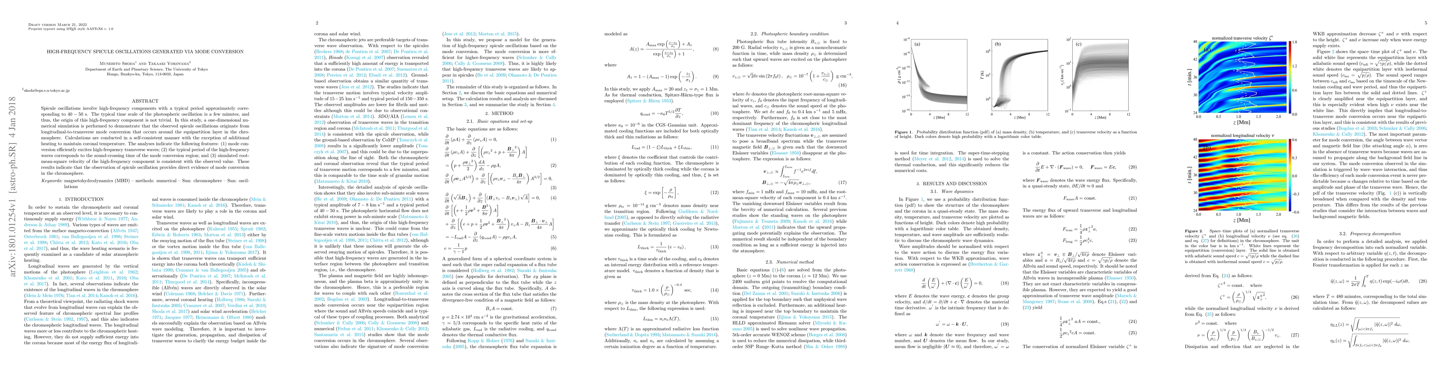 This research demonstrates through numerical simulations that high-frequency oscillations in spicules, typically around 40-50 seconds, arise from longitudinal-to-transverse mode conversion in the chromosphere, particularly at the equipartition layer. The findings suggest that this conversion efficiently excites high-frequency transverse waves, consistent with observations.