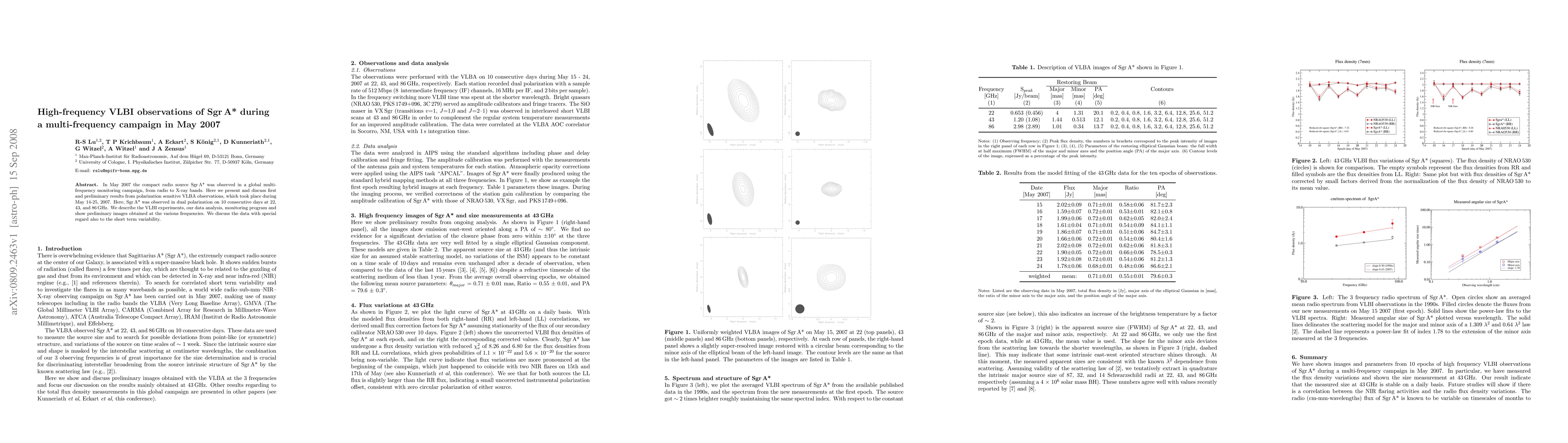 Researchers conducted high-frequency VLBI observations of Sgr A*, a compact radio source, in May 2007, revealing short-term variability in dual polarization at multiple frequencies.