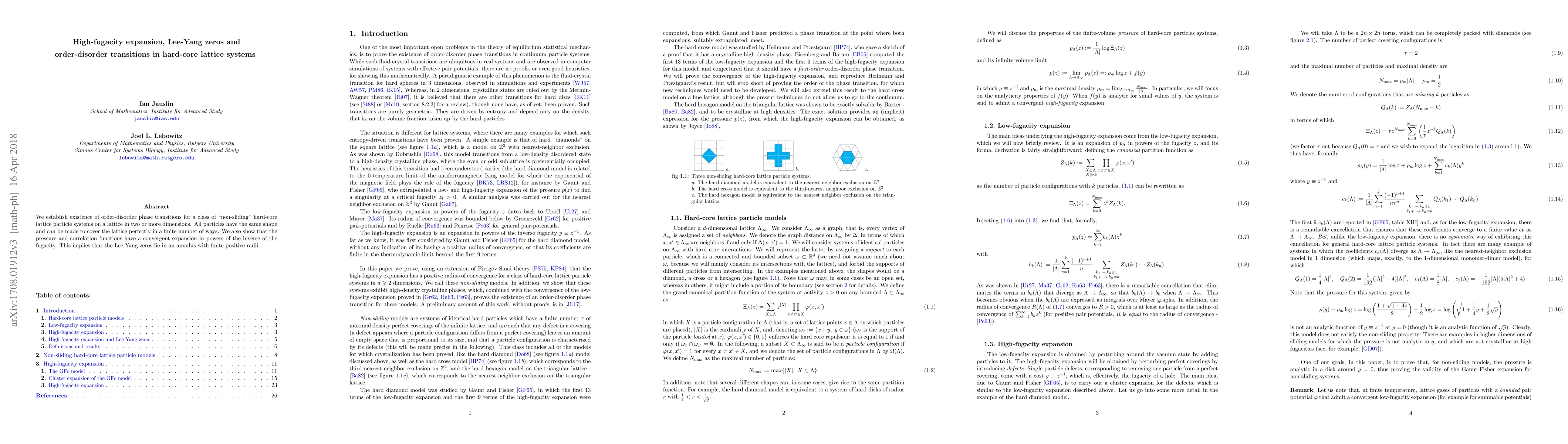 This paper demonstrates the existence of order-disorder phase transitions in non-sliding hard-core lattice systems, proving convergent high-fugacity expansions and showing that Lee-Yang zeros are confined within a finite annulus.
