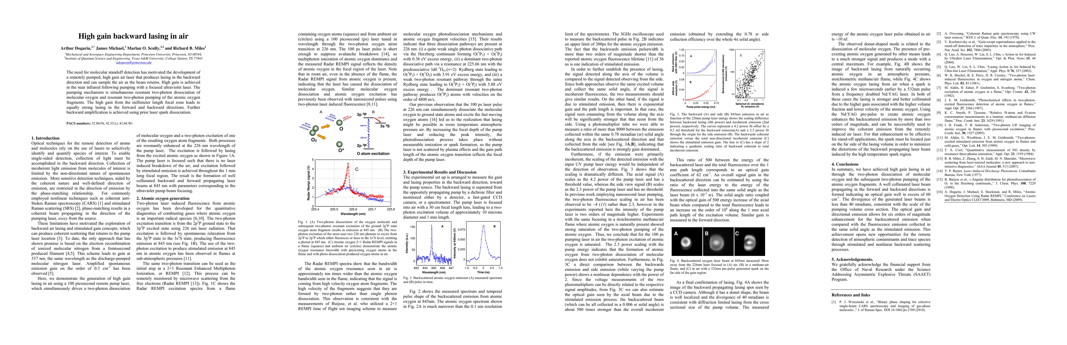 The need for molecular standoff detection has motivated the development of a remotely pumped, high gain air laser that produces lasing in the backward direction and can sample the air as the beam returns. High gain is achieved in the near infrared following pumping with a focused ultraviolet laser. The pumping mechanism is simultaneous resonant two-photon dissociation of molecular oxygen and resonant two-photon pumping of the atomic oxygen fragments. The high gain from the millimeter length focal zone leads to equally strong lasing in the forward and backward directions. Further backward amplification is achieved using prior laser spark dissociation.