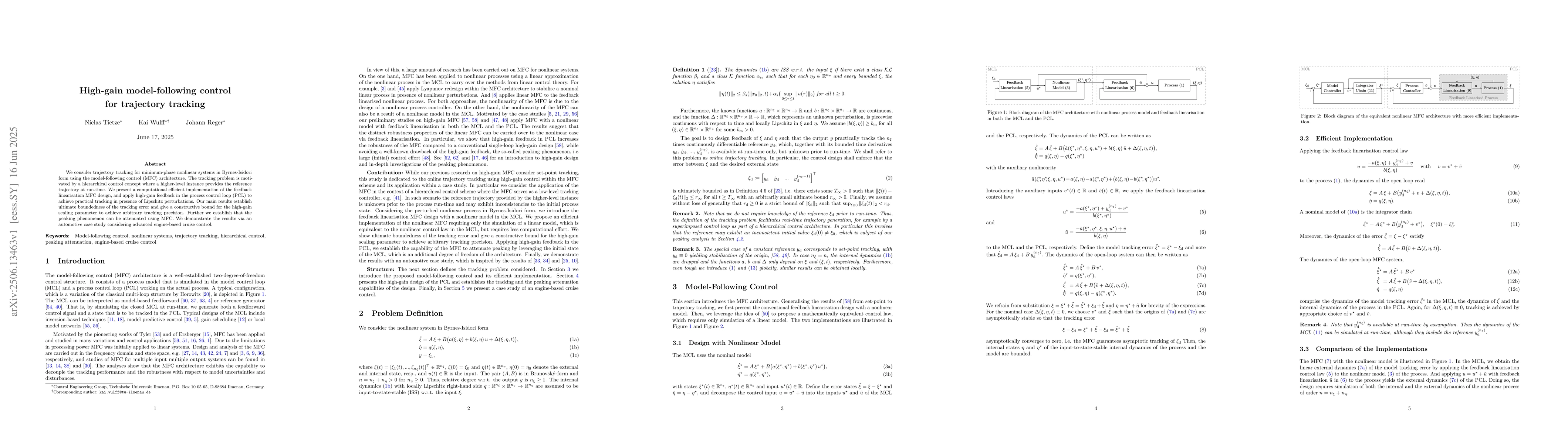 We consider trajectory tracking for minimum-phase nonlinear systems in Byrnes-Isidori form using the model-following control (MFC) architecture. The tracking problem is motivated by a hierarchical control concept where a higher-level instance provides the reference trajectory at run-time. We present a computational efficient implementation of the feedback linearisation MFC design, and apply high-gain feedback in the process control loop (PCL) to achieve practical tracking in presence of Lipschitz perturbations. Our main results establish ultimate boundedness of the tracking error and give a constructive bound for the high-gain scaling parameter to achieve arbitrary tracking precision. Further we establish that the peaking phenomenon can be attenuated using MFC. We demonstrate the results via an automotive case study considering advanced engine-based cruise control.