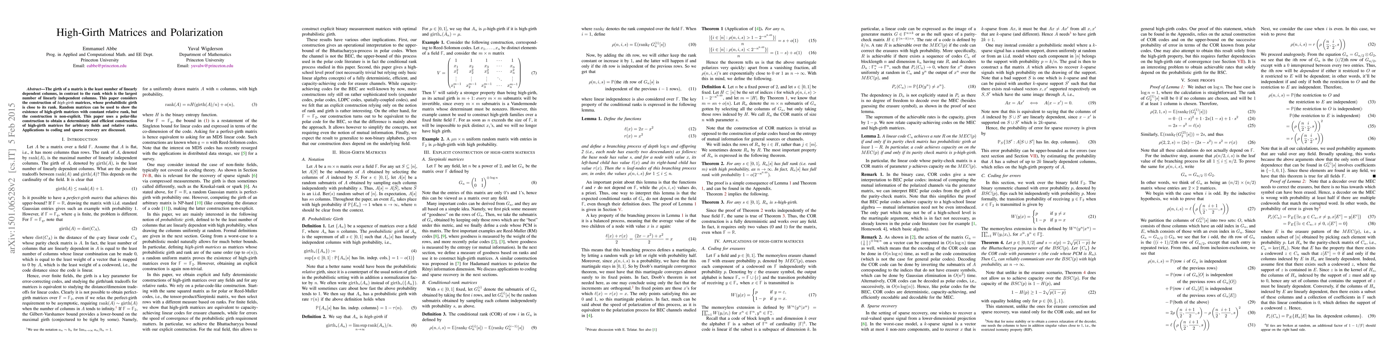 This paper presents a deterministic method for constructing high-girth matrices with girth close to their rank, contrasting with probabilistic methods. The polar-like construction is efficient and applicable across various fields, with implications for coding and sparse recovery.