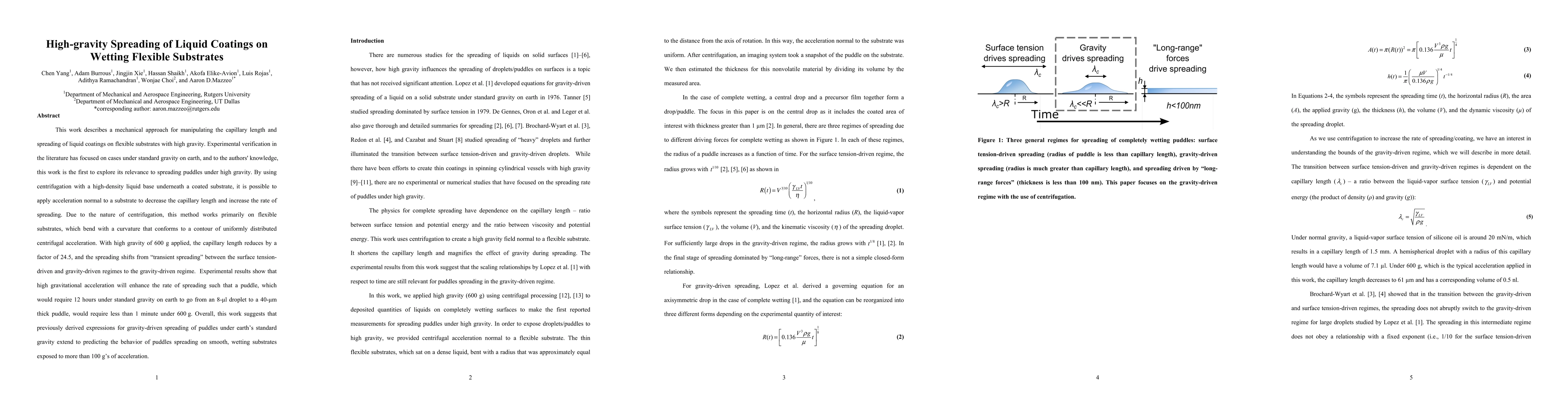 This study investigates the high-gravity spreading of liquid coatings on flexible substrates using centrifugation, demonstrating that high gravitational acceleration significantly increases the spreading rate. Under 600 g, the capillary length decreases by 24.5 times, shifting spreading from surface tension-driven to gravity-driven, and reducing the time for a puddle to form from minutes to seconds.