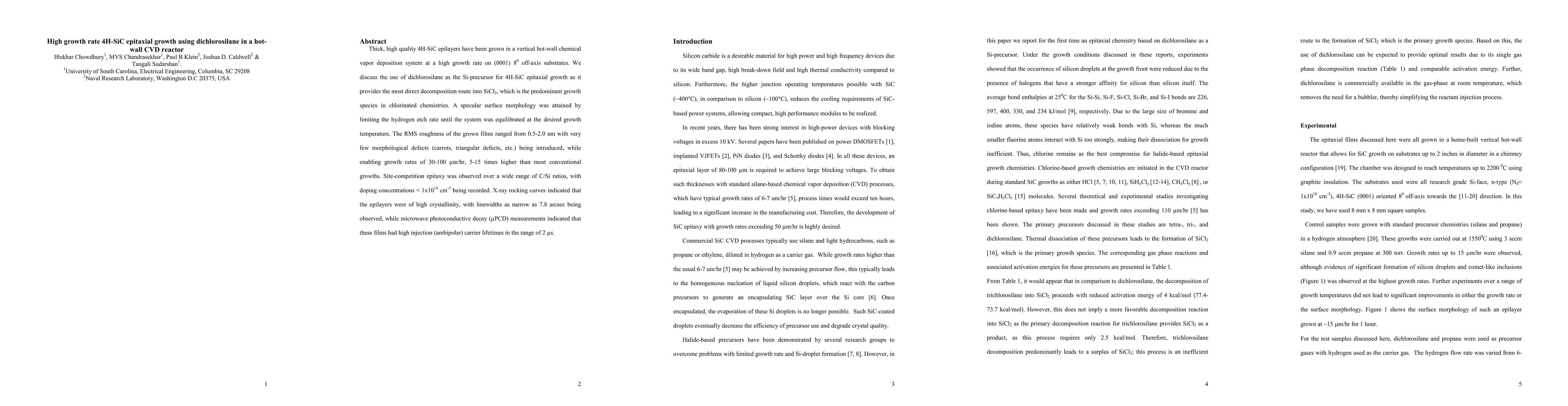 This paper reports high growth rate 4H-SiC epitaxial growth using dichlorosilane in a hot-wall CVD reactor, achieving rates 5-15 times higher than conventional methods with minimal defects and high crystallinity. The epilayers exhibit RMS roughness of 0.5-2.0 nm and high injection carrier lifetimes of 2 \mus.