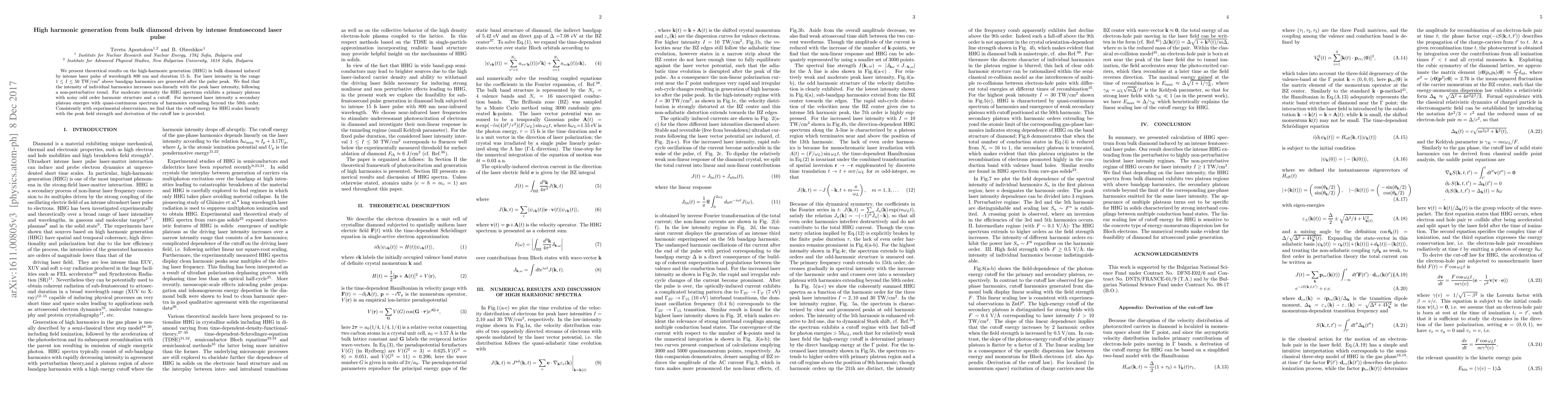 This paper investigates high-harmonic generation (HHG) in bulk diamond driven by intense 800 nm, 15 fs femtosecond laser pulses. The study reveals that harmonics are generated post-pulse peak, with their intensity increasing non-linearly with peak laser intensity, and a secondary plateau of harmonics emerges at higher intensities.