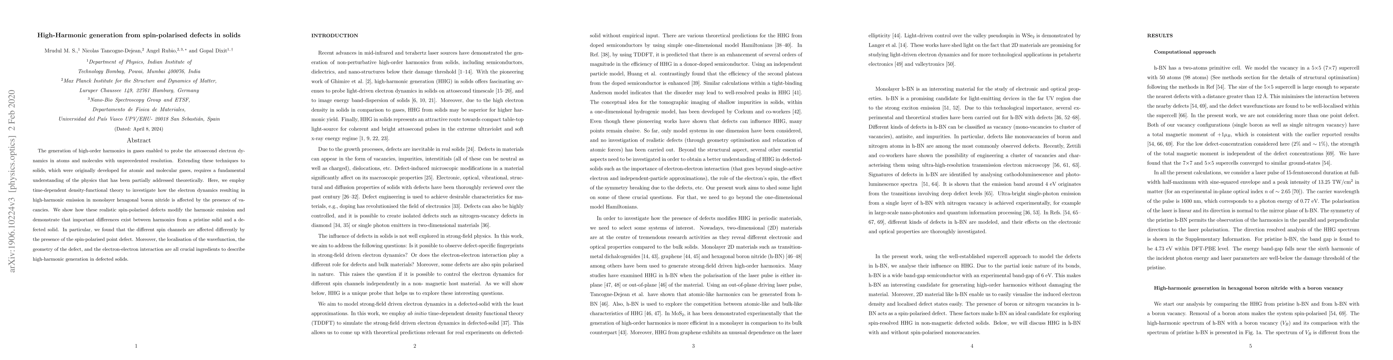 Generation of high-order harmonics in gases enabled to probe the attosecond electron dynamics in atoms and molecules with unprecedented resolution. Extending the techniques developed originally for atomic and molecular gases to solid state materials requires a fundamental understanding of the physics that has been partially addressed theoretically. Here we employ time-dependent density-functional theory to investigate how the electron dynamics resulting in high-harmonic emission in monolayer hexagonal boron nitride is affected by the presence of vacancies. We show how these realistic spin-polarised defects modify the harmonic emission, and demonstrate that important differences exist between harmonics from a pristine solid and a defected-solid. In particular, we found that the different spin channels are affected differently because of the presence of the spin-polarized point defect, and that localisation of the wavefunction, the geometry of the defect and the electron-electron interaction are all important ingredients to describe high-harmonic generation in defected-solids. We show that different vacancies lead to qualitatively different effects, thus opening the door to the high-harmonic imaging of spin-polarised defects in solids.