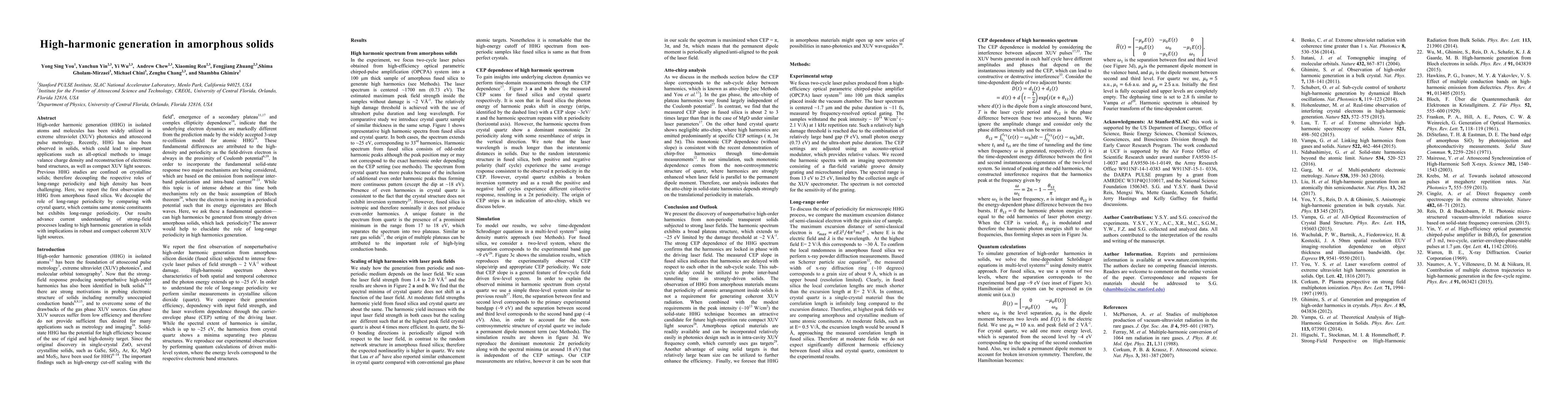 This paper reports the first observation of high-order harmonic generation (HHG) in amorphous fused silica, providing insights into the roles of long-range periodicity and high density in HHG. By comparing amorphous and crystalline quartz, the study advances understanding of strong-field processes in solids and suggests applications for compact XUV light sources.