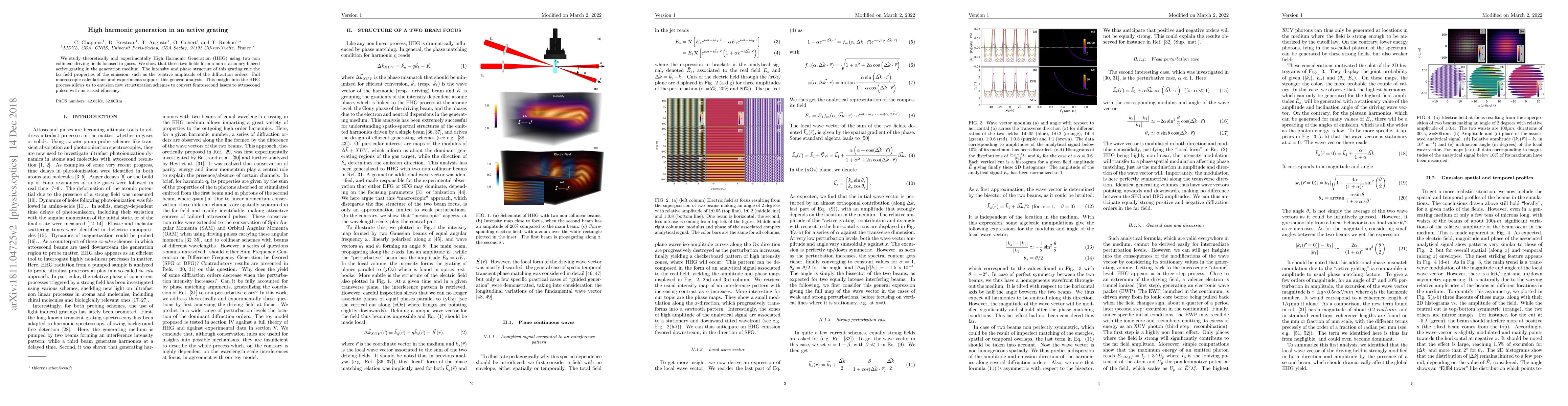This paper investigates High Harmonic Generation (HHG) using two non-collinear driving fields in gases, demonstrating that they form a non-stationary active grating that influences the emission's diffraction properties. Theoretical and experimental results support the role of the grating's intensity and phase structure, paving the way for improved attosecond pulse generation.