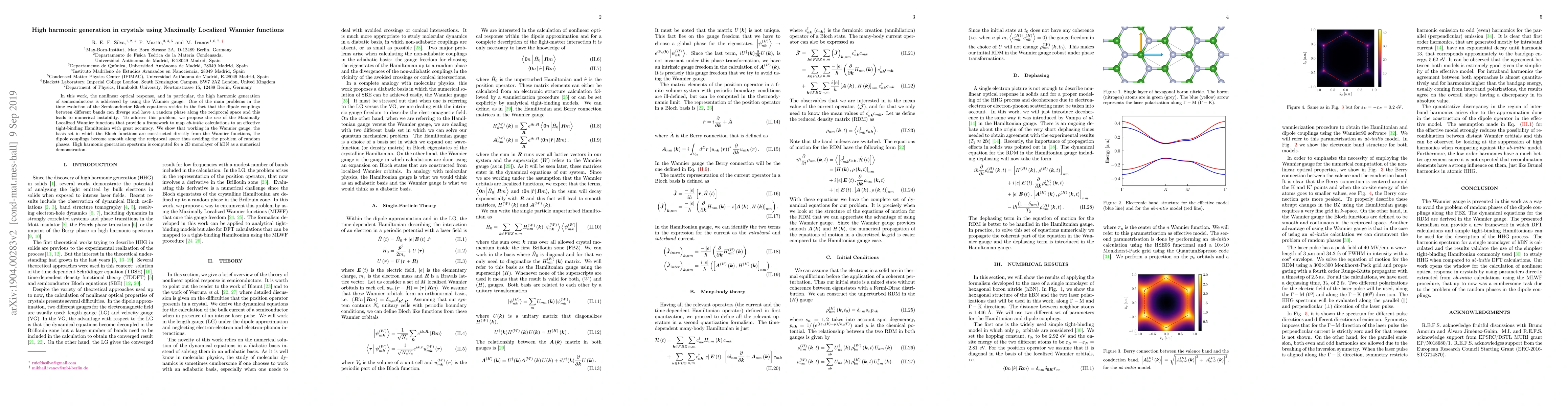 This paper proposes using Maximally Localized Wannier functions to address numerical instability in high harmonic generation in semiconductors. By employing the Wannier gauge, the dipole couplings become smooth, avoiding random phase issues, and demonstrating the method with a 2D monolayer of hBN.