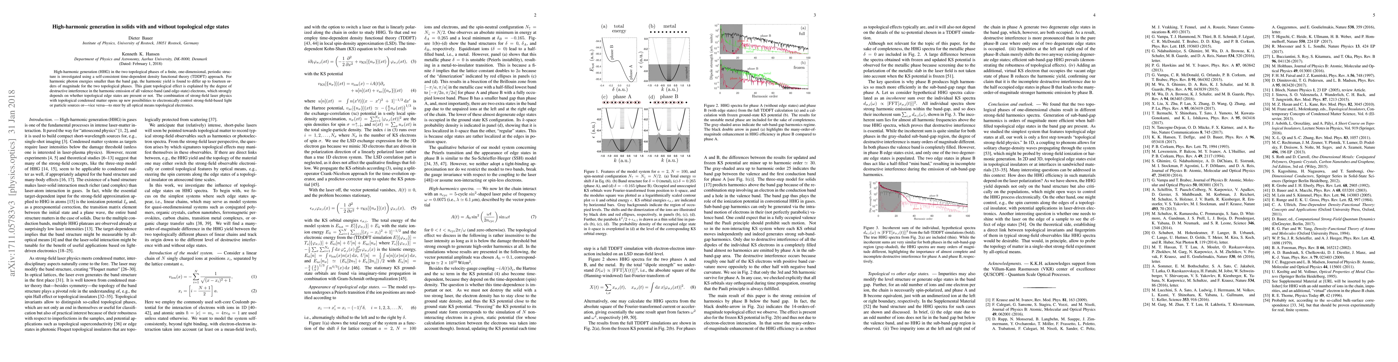 This paper investigates high-harmonic generation in topological and non-topological phases of a one-dimensional periodic structure, revealing a significant difference in harmonic yield due to the presence of topological edge states. The study highlights the potential for controlling light sources or steering topological electronics using strong-field laser physics.