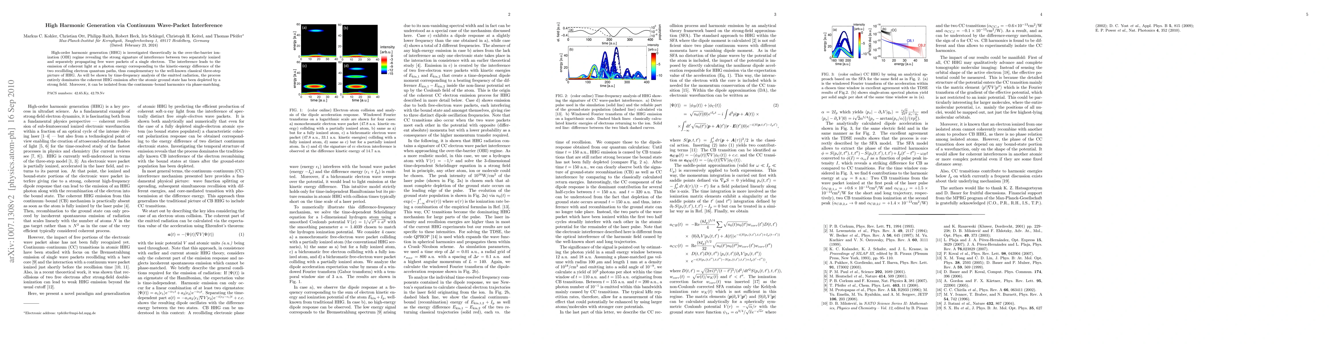This paper investigates high-order harmonic generation (HHG) in the over-the-barrier ionization regime, revealing interference between two ionized electron wave packets that leads to coherent light emission. This interference-based mechanism dominates HHG after the atomic ground state is depleted, and can be isolated from continuum-bound harmonics through phase-matching.
