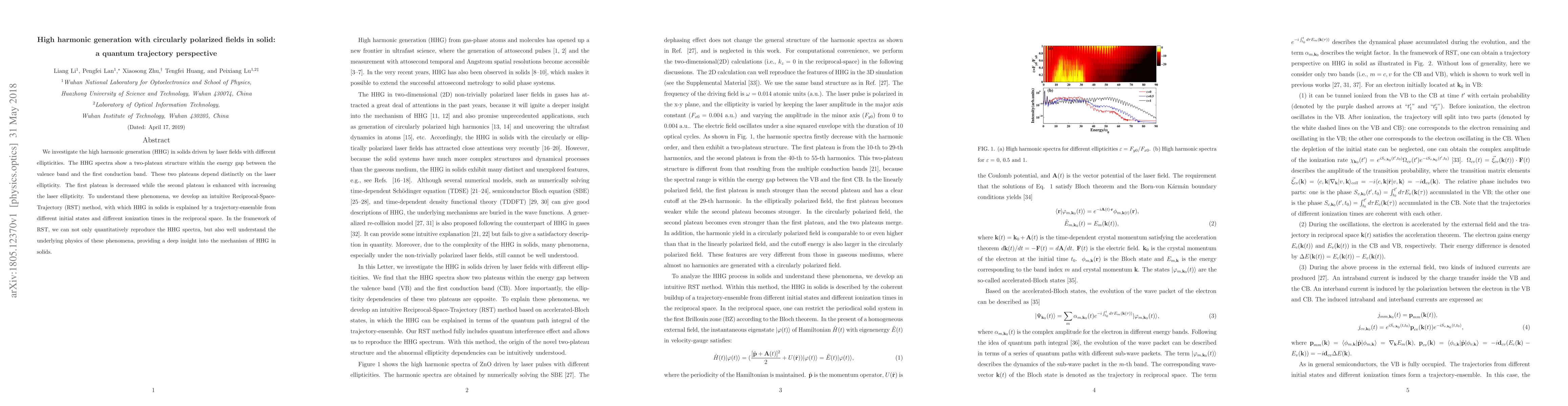This paper investigates high harmonic generation (HHG) in solids under circularly polarized laser fields, revealing a two-plateau structure in the spectra influenced by laser ellipticity. A novel Reciprocal-Space-Trajectory (RST) method is introduced to explain the phenomenon, offering quantitative reproduction of HHG spectra and elucidating the underlying physics.