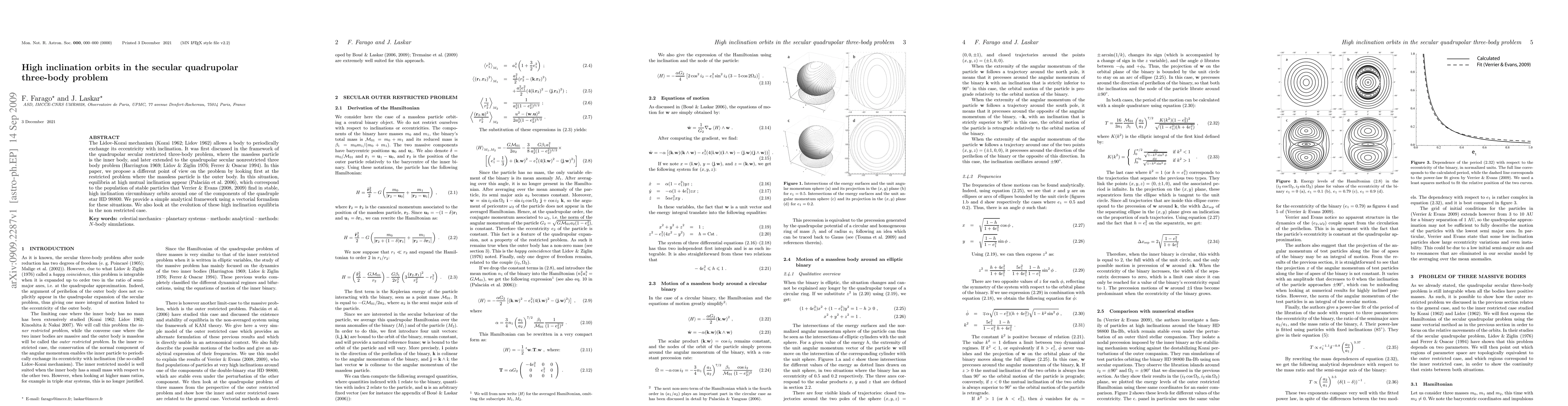 This paper explores high inclination orbits in the secular quadrupolar three-body problem through the Lidov-Kozai mechanism, focusing on equilibria where the massless particle is the outer body. It provides an analytical framework using a vectorial formalism to describe stable high inclination orbits, relevant to observations of circumbinary orbits in systems like HD 98800.