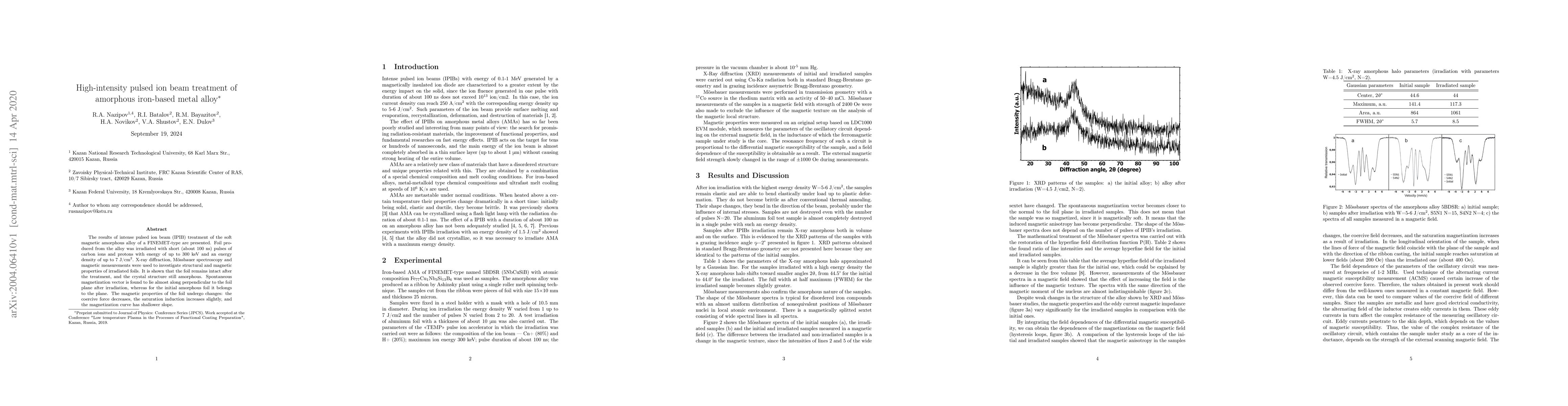 Abstract The results of intense pulsed ion beam (IPIB) treatment of the soft magnetic amorphous alloy of a FINEMET-type are presented. Foil produced from the alloy was irradiated with short (about 100 ns) pulses of carbon ions and protons with energy of up to 300 keV and an energy density of up to 7 J/cm2. X-ray diffraction, M\"ossbauer spectroscopy and magnetic measurements were used to investigate structural and magnetic properties of irradiated foils. It is shown that the foil remains intact after the treatment, and the crystal structure still amorphous. Spontaneous magnetization vector is found to lie almost along perpendicular to the foil plane after irradiation, whereas for the initial amorphous foil it belongs to the plane. The magnetic properties of the foil undergo changes: the coercive force decreases, the saturation induction increases slightly, and the magnetization curve has shallower slope.