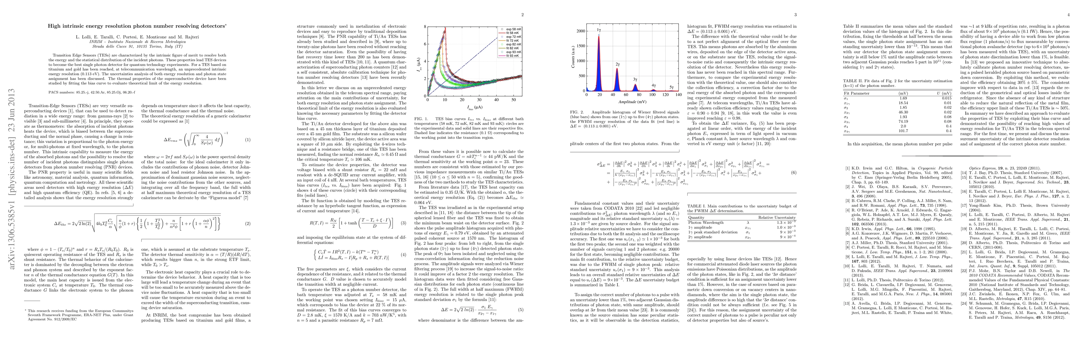 Transition Edge Sensors (TESs) are characterized by the intrinsic figure of merit to resolve both the energy and the statistical distribution of the incident photons. These properties lead TES devices to become the best single photon detector for quantum technology experiments. For a TES based on titanium and gold has been reached, at telecommunication wavelength, an unprecedented intrinsic energy resolution (0.113 eV). The uncertainties analysis of both energy resolution and photon state assignment has been discussed. The thermal properties of the superconductive device have been studied by fitting the bias curve to evaluate theoretical limit of the energy resolution.