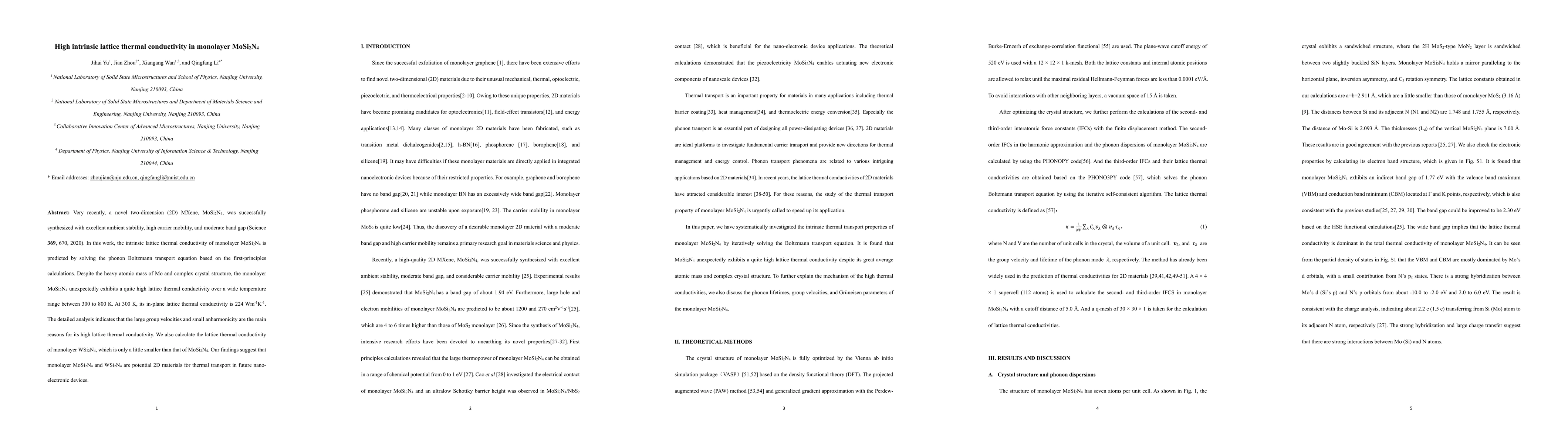 This study predicts that monolayer MoSi$_2$N$_4$ has unexpectedly high intrinsic lattice thermal conductivity despite its heavy atomic mass and complex structure, primarily due to large phonon group velocities and low anharmonicity. The in-plane thermal conductivity at 300 K is 224 Wm$^{-1}$K$^{-1}$, suggesting potential for use in thermal management in nano-electronic devices.