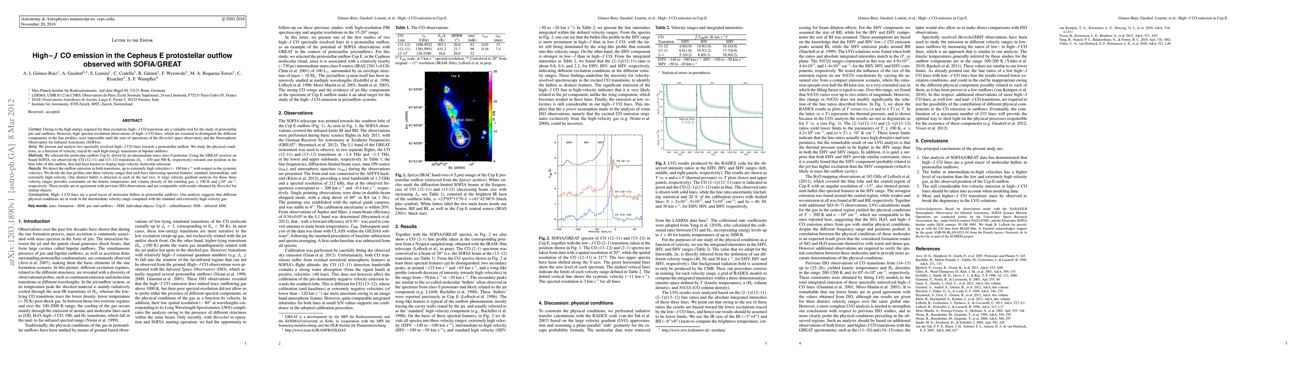 We present and analyze two spectrally resolved high-J CO lines towards the molecular outflow Cep E, driven by an intermediate-mass class 0 protostar. Using the GREAT receiver on board SOFIA, we observed the CO (12--11) and (13--12) transitions (E_u ~ 430 and 500 K, respectively) towards one position in the blue lobe of this outflow, that had been known to display high-velocity molecular emission. We detect the outflow emission in both transitions, up to extremely high velocities (~ 100 km/s with respect to the systemic velocity). We divide the line profiles into three velocity ranges that each have interesting spectral features: standard, intermediate, and extremely high-velocity. One distinct bullet is detected in each of the last two. A large velocity gradient analysis for these three velocity ranges provides constraints on the kinetic temperature and volume density of the emitting gas, >~ 100 K and > ~ 10^4 cm^-3, respectively. These results are in agreement with previous ISO observations and are comparable with results obtained by Herschel for similar objects. We conclude that high-J CO lines are a good tracer of molecular bullets in protostellar outflows. Our analysis suggests that different physical conditions are at work in the intermediate velocity range compared with the standard and extremely high-velocity gas at the observed position.