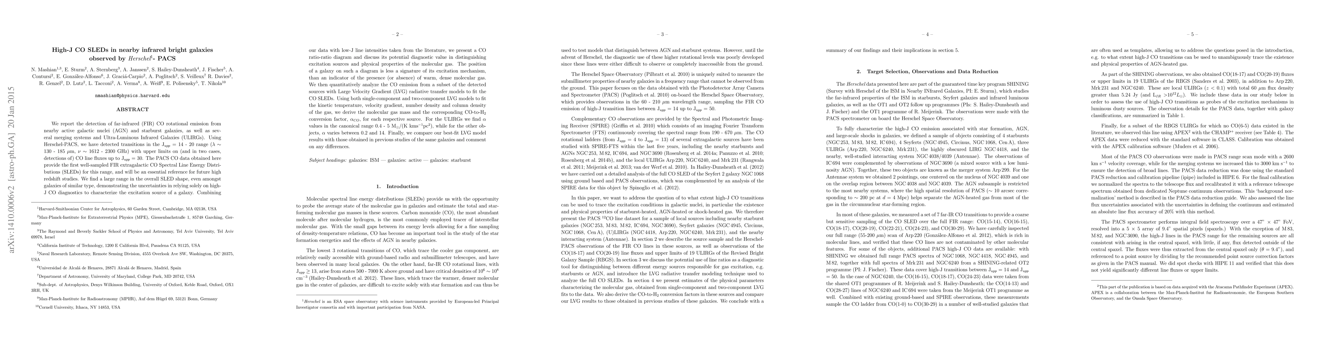 The paper presents the first well-sampled far-infrared extragalactic CO Spectral Energy Distributions (SLEDs) using Herschel-PACS, detecting transitions in the J$_{uparrow}$ = 14 - 20 range for nearby active galactic nuclei, starburst galaxies, merging systems, and ULIRGs. A wide range in SLED shapes is found, highlighting uncertainties in high-J CO diagnostics. Combining PACS data with low-J line intensities, a CO ratio-ratio diagram is proposed for distinguishing excitation sources and molecular gas properties. Large Velocity Gradient (LVG) radiative transfer models are used to analyze a subset of sources, deriving molecular gas mass and CO-to-H$_2$ conversion factors, α_CO. ULIRGs show α_CO within the canonical range, while other objects exhibit a broader variation.