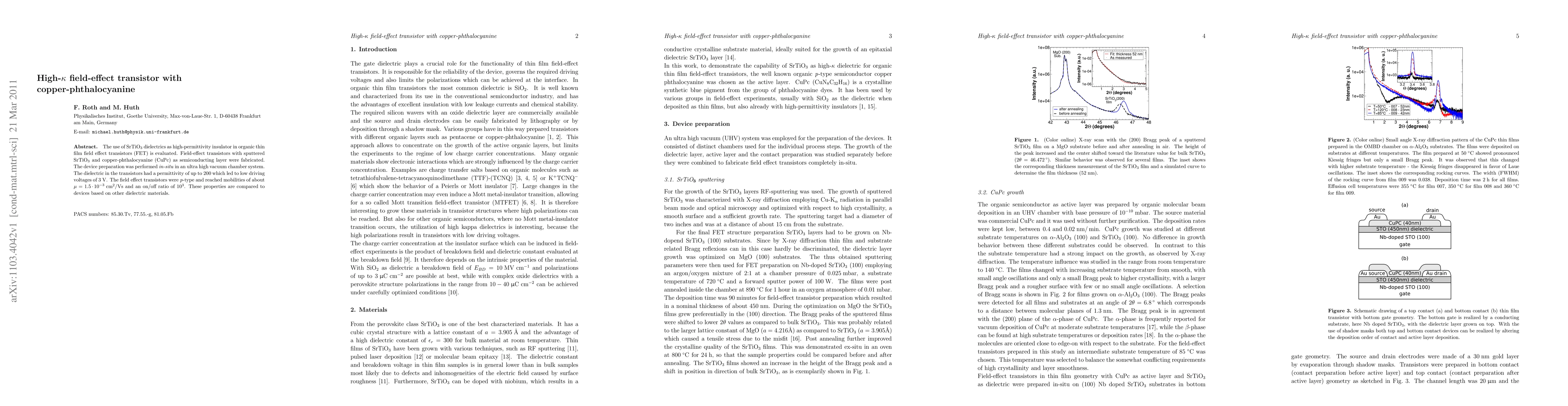 This paper evaluates SrTiO$_3$ dielectrics in organic thin film FETs with copper-phthalocyanine as the semiconducting layer, achieving low driving voltages of 3 V and p-type mobility of $\mu = 1.5\times 10^{-3}$ cm$^2$/Vs, demonstrating superior performance compared to other dielectric materials.