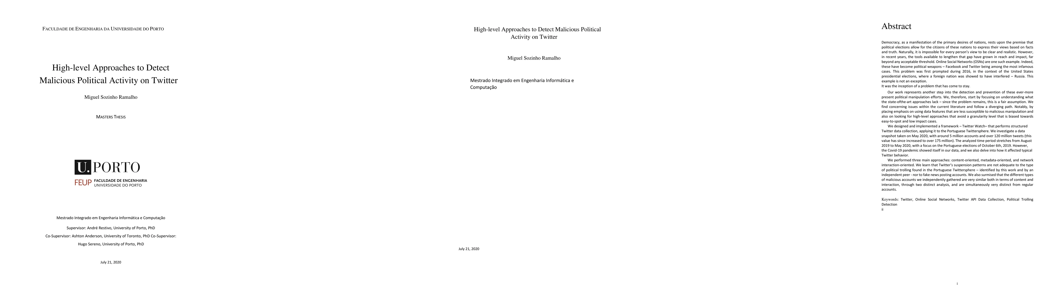 Our work represents another step into the detection and prevention of these ever-more present political manipulation efforts. We, therefore, start by focusing on understanding what the state-of-the-art approaches lack -- since the problem remains, this is a fair assumption. We find concerning issues within the current literature and follow a diverging path. Notably, by placing emphasis on using data features that are less susceptible to malicious manipulation and also on looking for high-level approaches that avoid a granularity level that is biased towards easy-to-spot and low impact cases. We designed and implemented a framework -- Twitter Watch -- that performs structured Twitter data collection, applying it to the Portuguese Twittersphere. We investigate a data snapshot taken on May 2020, with around 5 million accounts and over 120 million tweets (this value has since increased to over 175 million). The analyzed time period stretches from August 2019 to May 2020, with a focus on the Portuguese elections of October 6th, 2019. However, the Covid-19 pandemic showed itself in our data, and we also delve into how it affected typical Twitter behavior. We performed three main approaches: content-oriented, metadata-oriented, and network interaction-oriented. We learn that Twitter's suspension patterns are not adequate to the type of political trolling found in the Portuguese Twittersphere -- identified by this work and by an independent peer - nor to fake news posting accounts. We also surmised that the different types of malicious accounts we independently gathered are very similar both in terms of content and interaction, through two distinct analysis, and are simultaneously very distinct from regular accounts.