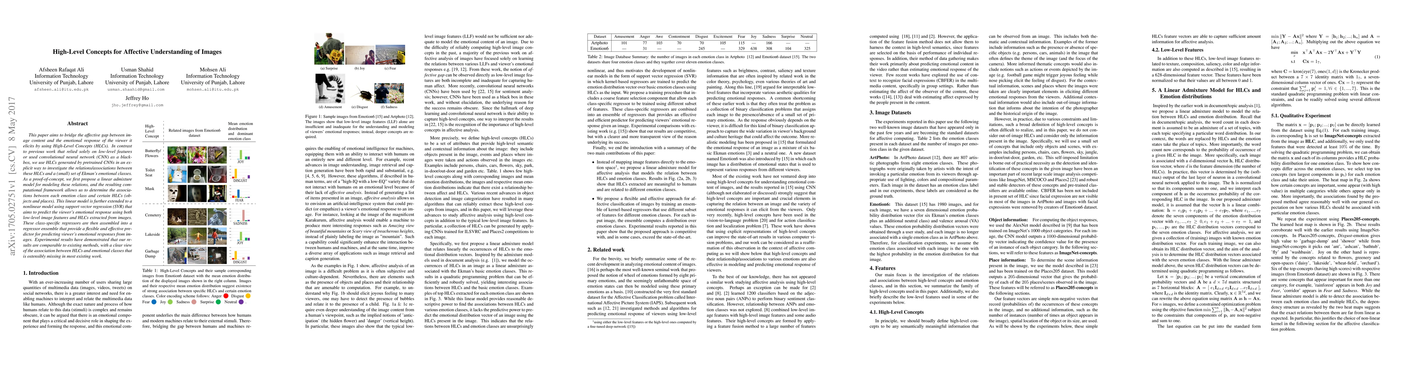 This paper aims to bridge the affective gap between image content and the emotional response of the viewer it elicits by using High-Level Concepts (HLCs). In contrast to previous work that relied solely on low-level features or used convolutional neural network (CNN) as a black-box, we use HLCs generated by pretrained CNNs in an explicit way to investigate the relations/associations between these HLCs and a (small) set of Ekman's emotional classes. As a proof-of-concept, we first propose a linear admixture model for modeling these relations, and the resulting computational framework allows us to determine the associations between each emotion class and certain HLCs (objects and places). This linear model is further extended to a nonlinear model using support vector regression (SVR) that aims to predict the viewer's emotional response using both low-level image features and HLCs extracted from images. These class-specific regressors are then assembled into a regressor ensemble that provide a flexible and effective predictor for predicting viewer's emotional responses from images. Experimental results have demonstrated that our results are comparable to existing methods, with a clear view of the association between HLCs and emotional classes that is ostensibly missing in most existing work.