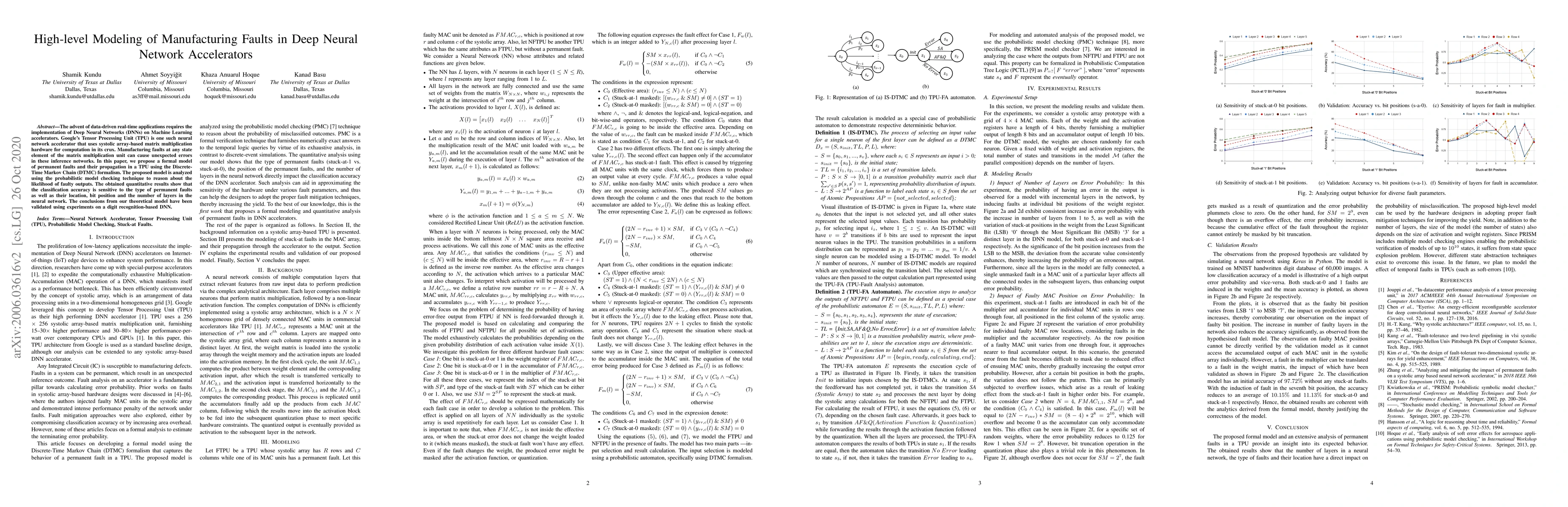 This paper proposes a formal model for analyzing permanent manufacturing faults in Google's Tensor Processing Unit (TPU) using Discrete-Time Markov Chain (DTMC) and probabilistic model checking. The study reveals that fault type, location, bit position, and neural network layer number significantly impact classification accuracy, validated through experiments on digit recognition DNNs.