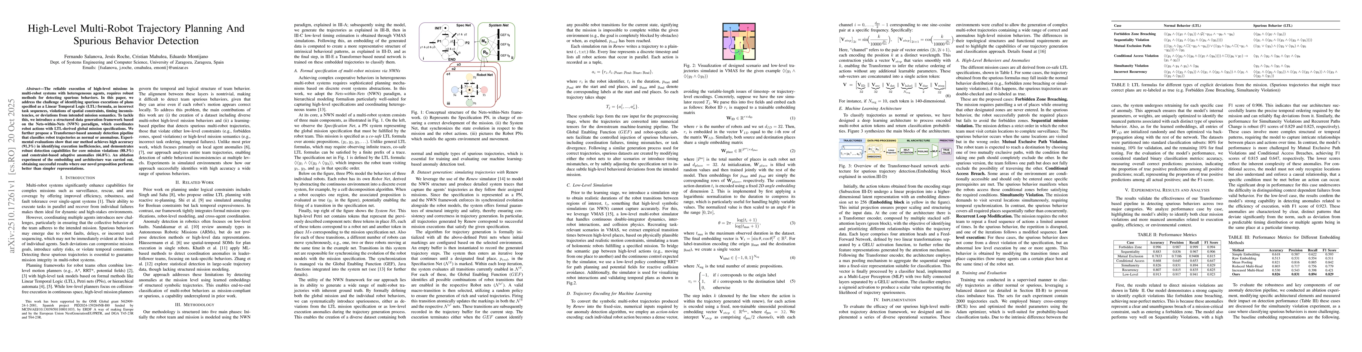 The reliable execution of high-level missions in multi-robot systems with heterogeneous agents, requires robust methods for detecting spurious behaviors. In this paper, we address the challenge of identifying spurious executions of plans specified as a Linear Temporal Logic (LTL) formula, as incorrect task sequences, violations of spatial constraints, timing inconsis- tencies, or deviations from intended mission semantics. To tackle this, we introduce a structured data generation framework based on the Nets-within-Nets (NWN) paradigm, which coordinates robot actions with LTL-derived global mission specifications. We further propose a Transformer-based anomaly detection pipeline that classifies robot trajectories as normal or anomalous. Experi- mental evaluations show that our method achieves high accuracy (91.3%) in identifying execution inefficiencies, and demonstrates robust detection capabilities for core mission violations (88.3%) and constraint-based adaptive anomalies (66.8%). An ablation experiment of the embedding and architecture was carried out, obtaining successful results where our novel proposition performs better than simpler representations.