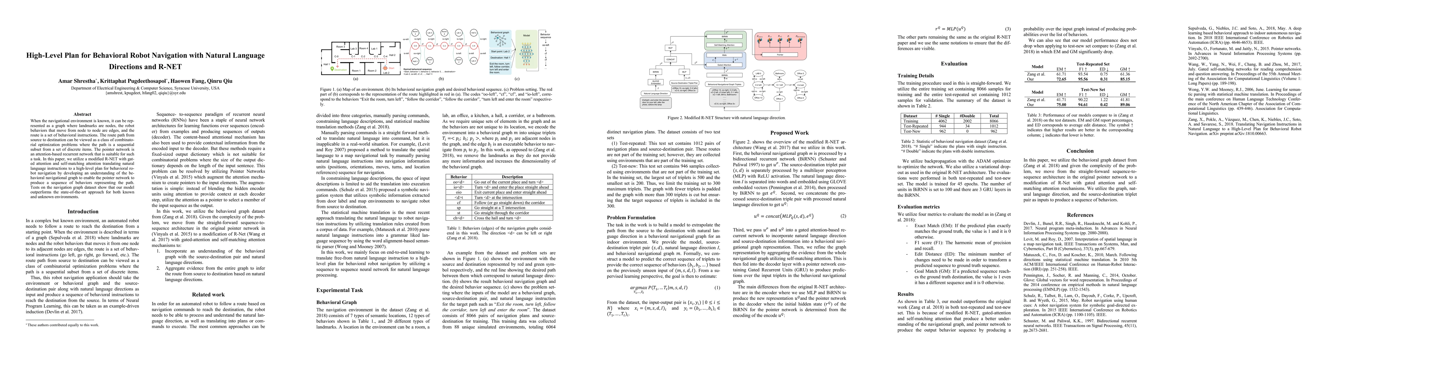 This paper proposes a modified R-NET with gated and self-matching attention to translate natural language instructions into a high-level plan for behavioral robot navigation. The model outperforms existing methods for both known and unknown navigational environments.